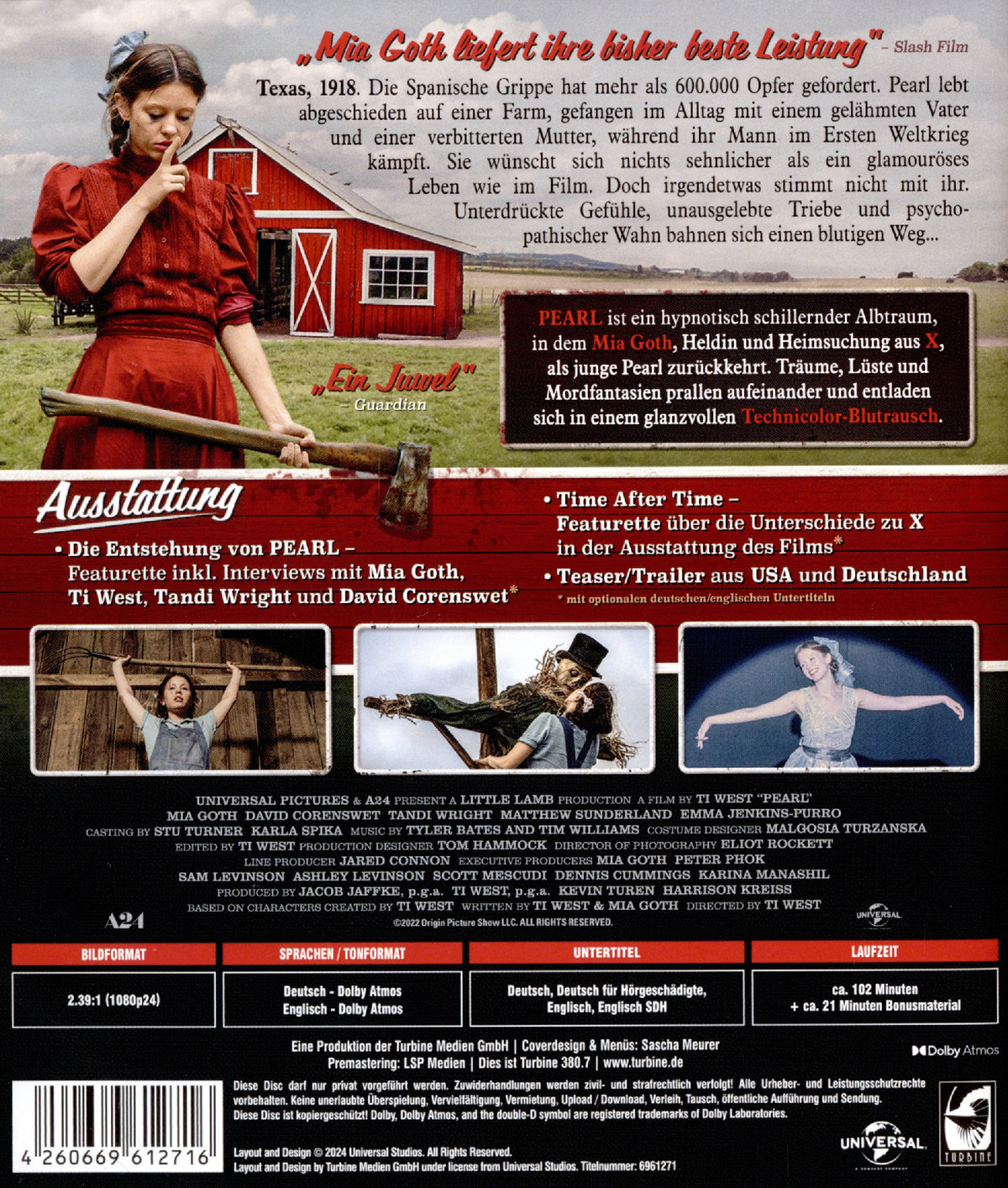 PEARL ist ein hypnotisch schillernder Albtraum, der im Hollywood-Look der 1950er-Jahre zum faszinierenden Horror-Ereignis wird. Mia Goth, Heldin und Heimsuchung aus X, kehrt als junge Pearl zurück, deren Träume, Lüste und Mordfantasien aufeinanderprallen und sich in einem glanzvollen Technicolor-Blutrausch entladen.