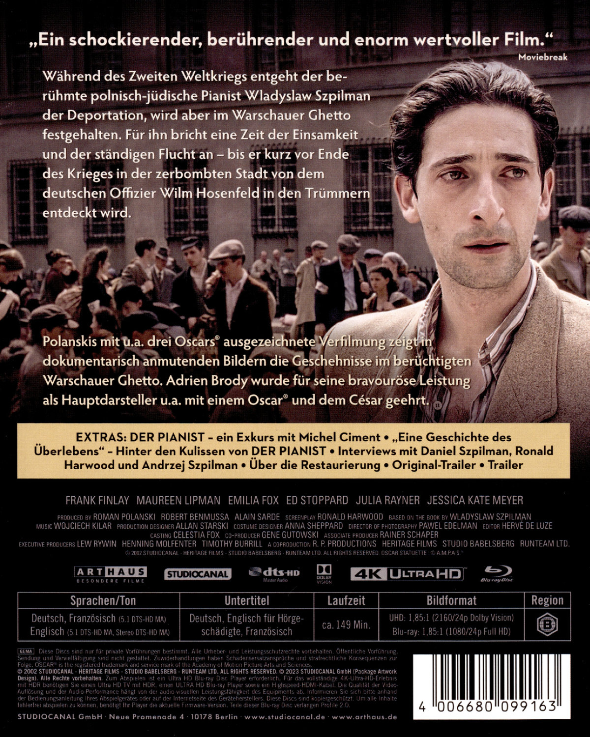 Roman Polanskis berührende Verfilmung nach einem Drehbuch von Ronald Harwood basiert auf der Autobiografie "Der Pianist - mein wunderbares Überleben" des polnischen Pianisten und Komponisten Wladyslaw Szpilman. Ausgezeichnet u.a. mit drei Oscars® (Beste Regie, Bester Hauptdarsteller, Bestes adaptiertes Drehbuch), sieben Césars, dem europäischen Filmpreis und der Goldenen Palme, zeigt DER PIANIST in dokumentarisch anmutenden Bildern die erschütternden Geschehnisse im berüchtigten Warschauer Ghetto zur Zeit des Zweiten Weltkrieges. Adrien Brody erhielt für seine bravouröse Leistung als Hauptdarsteller seinen ersten Oscar®, einen französischen César, den Preis der US-amerikanischen National Society of Film Critics sowie zahlreiche Nominierungen, u.a. für den Golden Globe®. Weitere Rollen sind mit Thomas Kretschmann (Blade II, U-571) und Frank Finlay (Lifeforce, Die drei Musketiere) ebenfalls grandios besetzt.