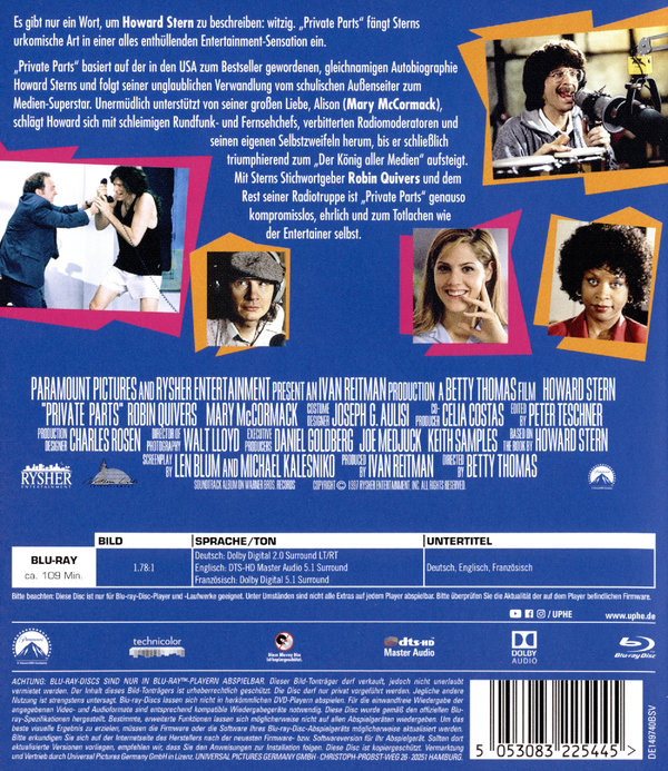 Es gibt nur ein Wort, um Howard Stern zu beschreiben: witzig."Private Parts" fängt Howards urkomische Art ein in einer alles entblößenden Entertainment-Sensation.Auf dem Nummer-1-Bestseller basierend, folgt "Private Parts" Howards unglaublicher Umwandlung vom Freak in der Schule zum Superstar in den Medien. Mit der unermüdlichen Unterstützung seiner wahren Liebe, Alison (Mary McCormack), schlägt sich Howard mit schleimigen Rundfunk- und Fernsehgeschäftsführern, verbitterten Radiomoderatoren und seinen eigenen Selbstzweifeln herum, um triumphierend als "Der König aller Medien" aufzusteigen.Mit Howards Stichwortgeber Robin Quivers und dem Rest von Sterns Radiotruppe ist "Private Parts" genauso kompromisslos, ehrlich und zum Todlachen wie Howard Stern selbst.