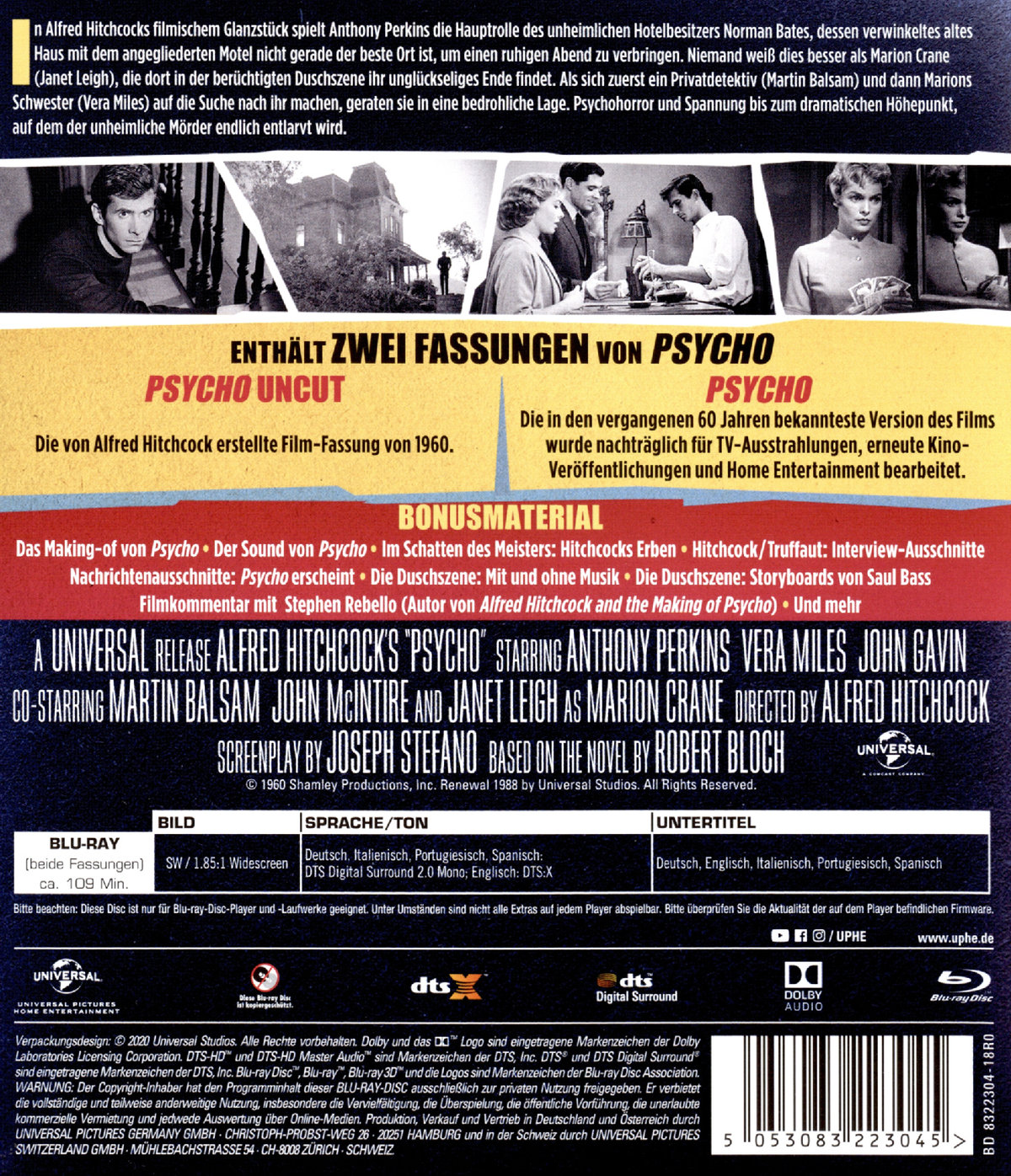 In Alfred Hitchcocks filmischem Glanzstück spielt Anthony Perkins die Hauptrolle des unheimlichen Hotelbesitzers Norman Bates, dessen verwinkeltes altes Haus mit dem angegliederten Motel nicht gerade der beste Ort ist, um einen ruhigen Abend zu verbringen.Niemand weiß dies besser als Marion Crane (Janet Leigh), die dort in der berüchtigten Duschszene ihr unglückseliges Ende findet. Als sich zuerst ein Privatdetektiv (Martin Balsam) und dann Marions Schwester (Vera Miles) auf die Suche nach ihr machen, geraten sie in eine bedrohliche Lage.Psychohorror und Spannung bis zum dramatischen Höhepunkt, auf dem der unheimliche Mörder endlich entlarvt wird.Enthält zwei Fassungen von "Psycho""Psycho" UncutDie von Alfred Hitchcock erstellte Film-Fassung von 1960."Psycho"Die in den vergangenen 60 Jahren bekannteste Version des Films wurde nachträglich für TV-Ausstrahlungen, erneute Kino-Veröffentlichungen und Home Entertainment bearbeitet.