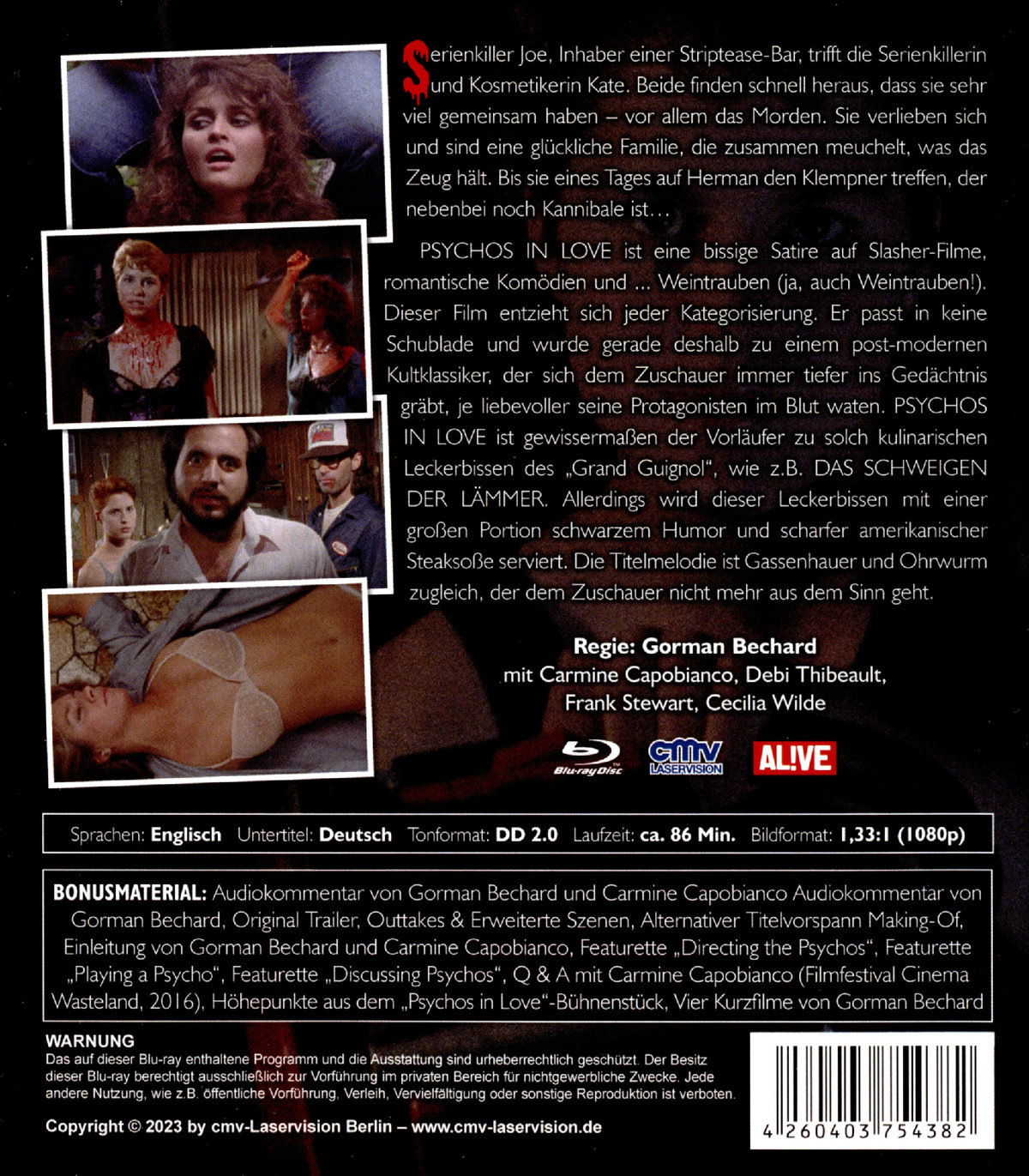 Audiokommentar von Gorman Bechard und Carmine Capobianco; Einleitung von Gorman Bechard und Carmine Capobianco; Original Trailer ; Outtakes & Erweiterte Szenen; Making-Of; Alternativer Titelvorspann ; Featurette "Directing the Psychos" (Interview mit Gorman Bechard) ; Featurette "Playing a Psycho" (Interview mit Carmine Capobianco) ; Featurette "Discussing Psychos" (Gespräch zwischen Gorman Bechard und Carmine Capobianco) ; Q & A mit Carmine Capobianco (Filmfestival Cinema Wasteland; 2016) ; Höhepunkte aus dem "Psychos in Love"-Bühnenstück ; Vier Kurzfilme von Gorman Bechard (Pairs; The Only Take; Bartholemew und Objects In The Mirror Are Further Than They Appear)