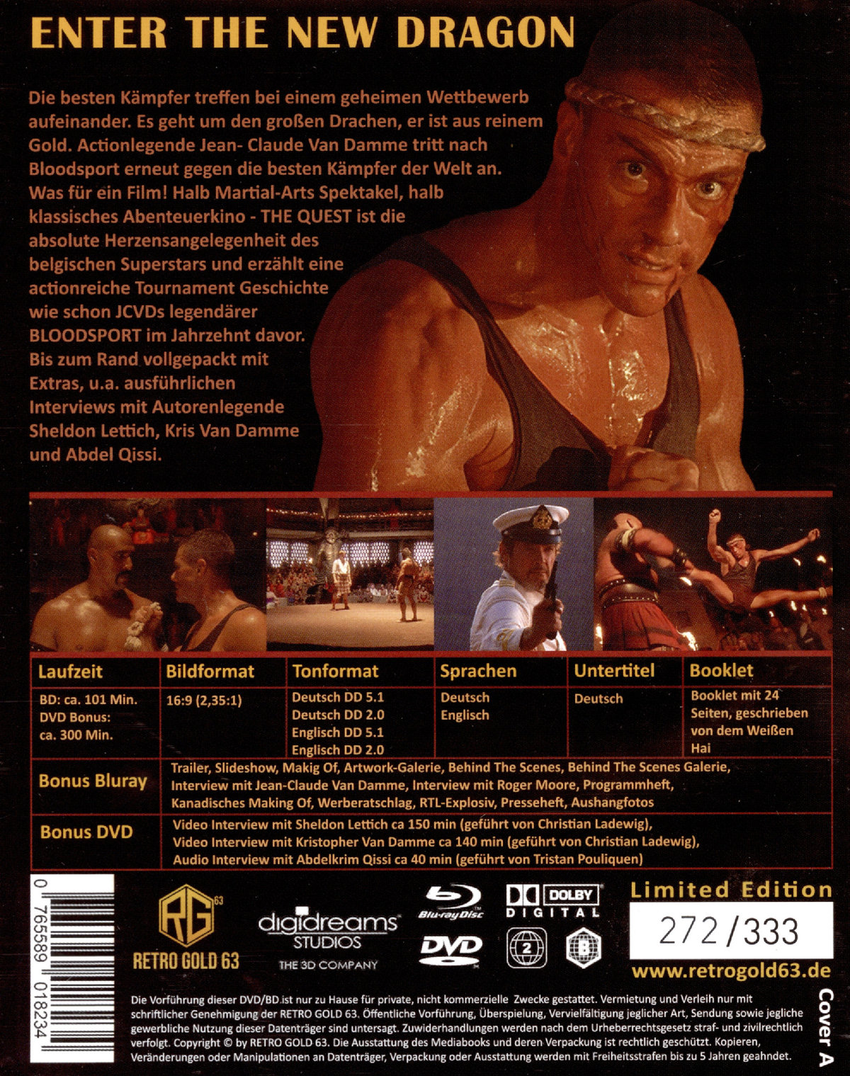 DVD-Version: Bildformat: 16:9 (1,78:1) - Tonformat: Mono - Sprachen: Deutsch - Bonus: Video Interview mit Sheldon Lettich ca 150 min (geführt von Christian Ladewig), Video Interview mit Kristopher Van Damme ca 140 min (geführt von Christian Ladewig), Audio Interview mit Abdelkrim Qissi ca 40 min (geführt von Tristan Pouliquen)
