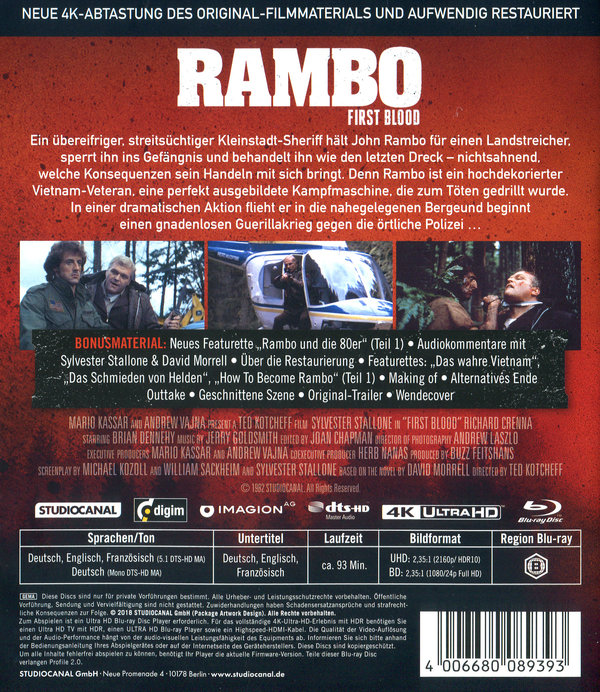 Neues Featurette: „Rambo und die 80er“ (Teil 1); Über die Restaurierung; Featurettes: „Das wahre Vietnam“, „Das Schmieden von Helden“, „How to become Rambo“ (Teil 1); Audiokommentare mit Sylvester Stallone & David Morrell; Making Of; Alternatives Ende; Outtake; Geschnittene Szene; Original-Trailer; Wendecover