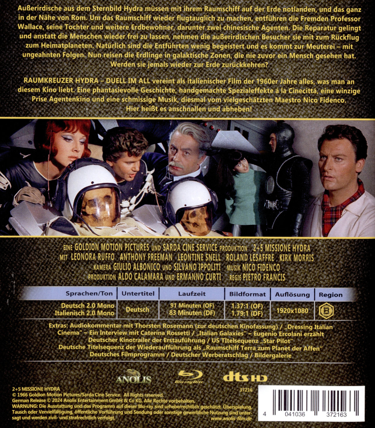Länge: 91 min. OF / 83 min. DF Außerirdische aus dem Sternbild Hydra müssen mit ihrem Raumschiff auf der Erde notlanden, und das ganz in der Nähe von Rom. Um das Raumschiff wieder flugtauglich zu machen, entführen die Fremden Professor Wallace, seine Tochter und weitere Erdbewohner, darunter zwei chinesische Agenten. Die Reparatur gelingt und anstatt die Menschen wieder frei zu lassen, nehmen die außerirdischen Besucher sie mit zum Rückflug zum Heimatplaneten. Natürlich sind die Entführten wenig begeistert und es kommt zur Meuterei – mit ungeahnten Folgen. Nun reisen die Erdlinge in galaktische Zonen, die nie zuvor ein Mensch gesehen hat. Werden sie jemals wieder zur Erde zurückkehren? RAUMKREUZER HYDRA – DUELL IM ALL vereint als italienischer Film der 1960er Jahre alles, was man an diesem Kino liebt. Eine phantasievolle Geschichte, handgemachte Spezialeffekte á la Cinecittà, eine winzige Prise Agentenkino und eine schmissige Musik, diesmal vom vielgeschätzten Maestro Nico Fidenco. Hier heißt es anschnallen und abheben!