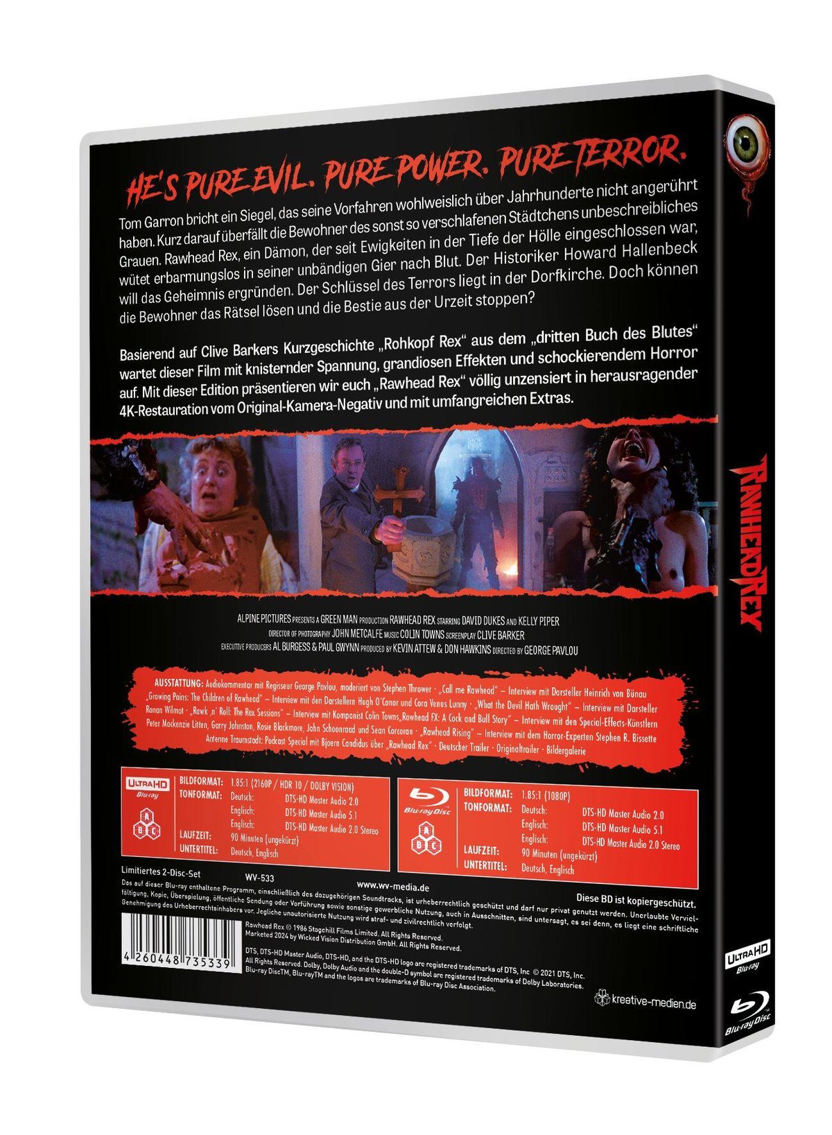 Tom Garron bricht ein Siegel, das seine Vorfahren wohlweislich über Jahrhunderte nicht angerührt haben. Kurz darauf überfällt die Bewohner des sonst so verschlafenen Städtchens unbeschreibliches Grauen. Rawhead Rex, ein Dämon, der seit Ewigkeiten in der Tiefe der Hölle eingeschlossen war, wütet erbarmungslos in seiner unbändigen Gier nach Blut. Der Historiker Howard Hallenbeck will das Geheimnis ergründen. Der Schlüssel des Terrors liegt in der Dorfkirche. Doch können die Bewohner das Rätsel lösen und die Bestie aus der Urzeit stoppen? Basierend auf Clive Barkers Kurzgeschichte „Rohkopf Rex“ aus dem „dritten Buch des Blutes“ wartet dieser Film mit knisternder Spannung, grandiosen Effekten und schockierendem Horror auf. Mit dieser Edition präsentieren wir euch „Rawhead Rex“ völlig unzensiert in herausragender 4K-Restauration vom Original-Kamera-Negativ und mit umfangreichen Extras. Sprache: Deutsch, Englisch Untertitel: Deutsch, Englisch Tonformate: DTS-HD Master Audio 2.0 (Dt. & Engl.), DTS-HD Master Audio 5.1 (Engl.) Bildformat: 1.85:1 (1080p) / 1.85:1 (2160p / HDR 10 / Dolby Vision)