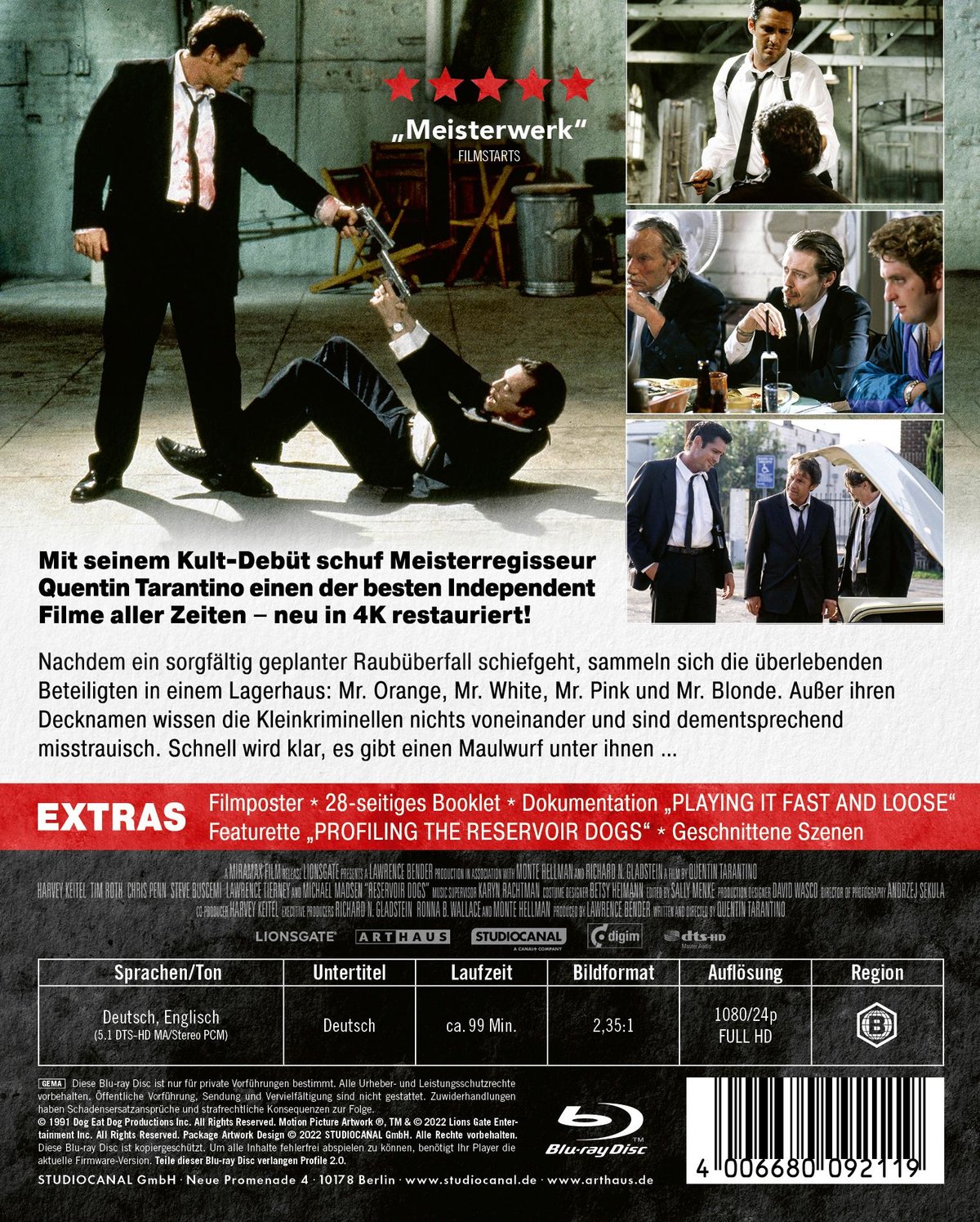 Quentin Tarantinos Debüt ist längst zum absoluten Kultklassiker aufgestiegen und gilt als einer der besten Independent-Filme aller Zeiten. Die unkonventionelle Erzählweise, die zitatwürdigen Dialogen und die gnadenlose Brutalität werden perfekt ergänzt von einem großartig aufspielenden Ensemble-Cast bestehend aus Harvey Keitel, Michael Madsen, Tim Roth, Steve Buscemi, Chris Penn und Quentin Tarantino selbst. Nach seiner Premiere beim Sundance Film Festival wurde Reservoir Dogs auch bei Cannes, Sitges und Toronto im Programm gezeigt und erhielt bei den Independent Spirit Awards drei Nominierungen. Eine Auszeichnung gab es für Steve Buscemi als bester männlicher Nebendarsteller.