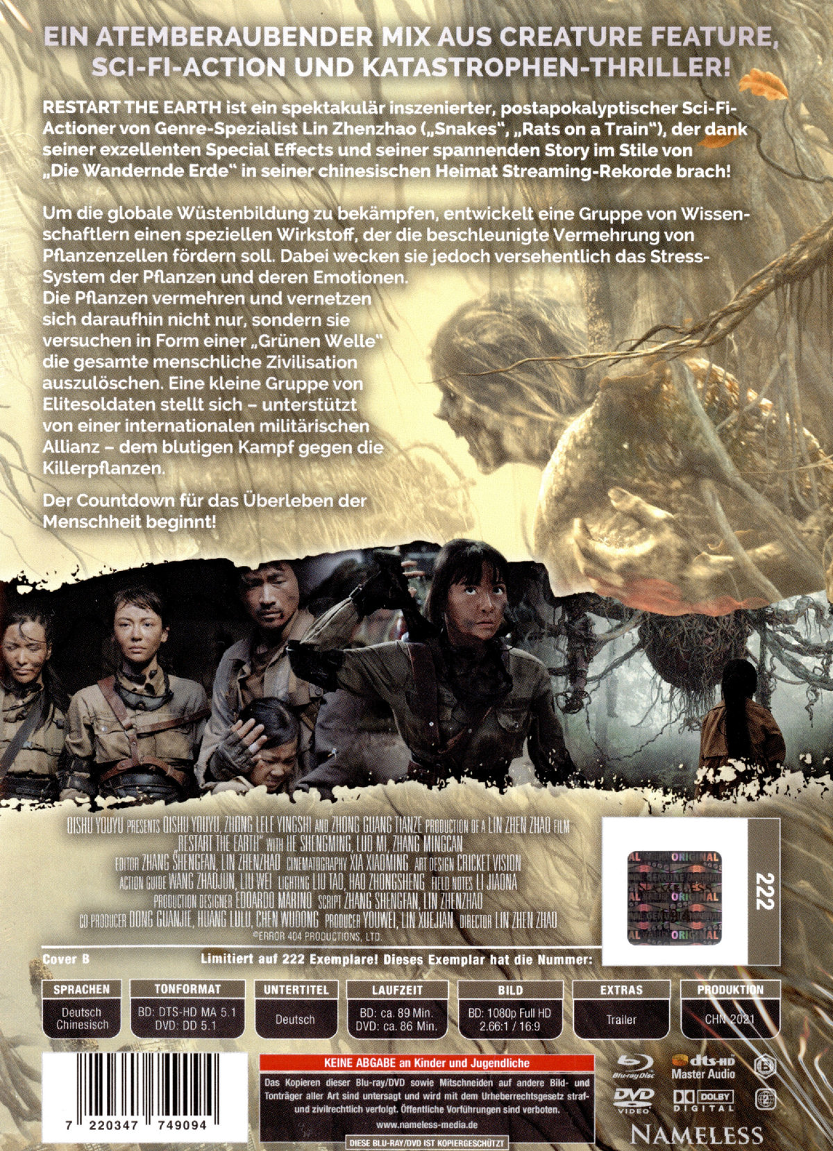 RESTART THE EARTH ist ein spektakulär inszenierter, postapokalyptischer Sci-Fi-Actioner von Genre-Spezialist Lin Zhenzhao („Snakes“, „Rats on a Train“), der dank seiner exzellenten Special Effects und seiner spannenden Story im Stile von „Die Wandernde Erde“ in seiner chinesischen Heimat Streaming-Rekorde brach! Um die globale Wüstenbildung zu bekämpfen, entwickelt eine Gruppe von Wissenschaftlern einen speziellen Wirkstoff, der die beschleunigte Vermehrung von Pflanzenzellen fördern soll. Dabei wecken sie jedoch versehentlich das Stress- System der Pflanzen und deren Emotionen. Die Pflanzen vermehren und vernetzen sich daraufhin nicht nur, sondern sie versuchen in Form einer „Grünen Welle“ die gesamte menschliche Zivilisation auszulöschen. Eine kleine Gruppe von Elitesoldaten stellt sich – unterstützt von einer internationalen militärischen Allianz – dem blutigen Kampf gegen die Killerpflanzen. Der Countdown für das Überleben der Menschheit beginnt!