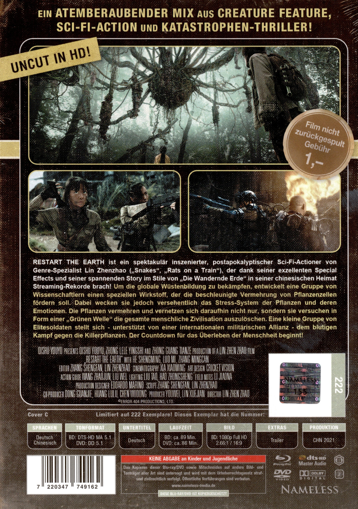 RESTART THE EARTH ist ein spektakulär inszenierter, postapokalyptischer Sci-Fi-Actioner von Genre-Spezialist Lin Zhenzhao („Snakes“, „Rats on a Train“), der dank seiner exzellenten Special Effects und seiner spannenden Story im Stile von „Die Wandernde Erde“ in seiner chinesischen Heimat Streaming-Rekorde brach! Um die globale Wüstenbildung zu bekämpfen, entwickelt eine Gruppe von Wissenschaftlern einen speziellen Wirkstoff, der die beschleunigte Vermehrung von Pflanzenzellen fördern soll. Dabei wecken sie jedoch versehentlich das Stress- System der Pflanzen und deren Emotionen. Die Pflanzen vermehren und vernetzen sich daraufhin nicht nur, sondern sie versuchen in Form einer „Grünen Welle“ die gesamte menschliche Zivilisation auszulöschen. Eine kleine Gruppe von Elitesoldaten stellt sich – unterstützt von einer internationalen militärischen Allianz – dem blutigen Kampf gegen die Killerpflanzen. Der Countdown für das Überleben der Menschheit beginnt!