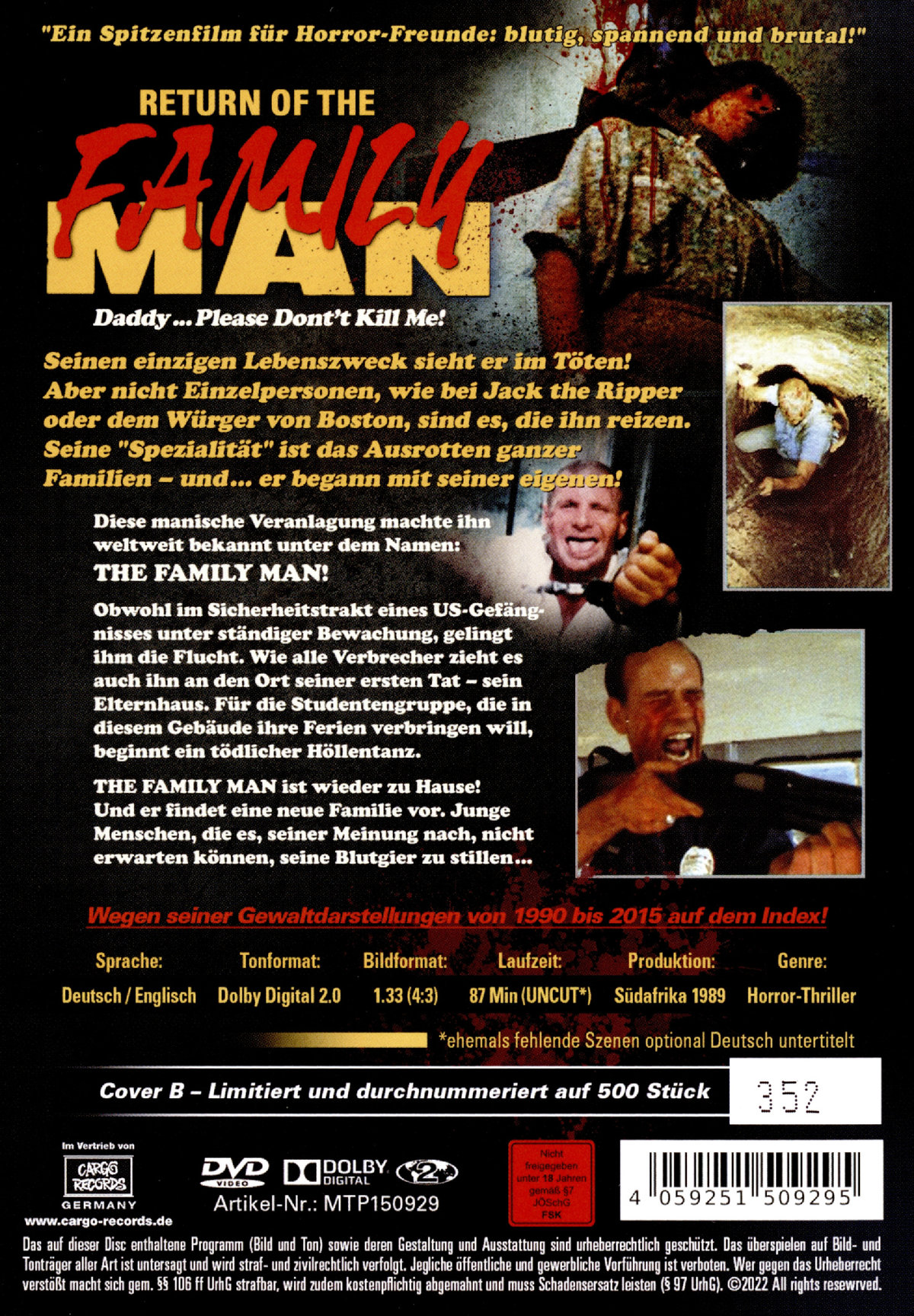 Seinen einzigen Lebenszweck sieht er im Töten. Aber nicht Einzelpersonen, wie bei Jack the Ripper oder dem Würger von Boston, sind es, die ihn reizen. Seine "Spezialität" ist das Ausrotten ganzer Familien, und ... er begann mit seiner eigenen! Diese manische Veranlagung machte ihn weltweit bekannt unter dem Namen: The Family Man. Sowohl im Sicherheitstrakt eines US-Gefängnisses unter ständiger Bewachung, gelingt ihm die Flucht. Wie alle Verbrecher zieht es auch ihn an den Ort seiner ersten Tat - sein Elternhaus.