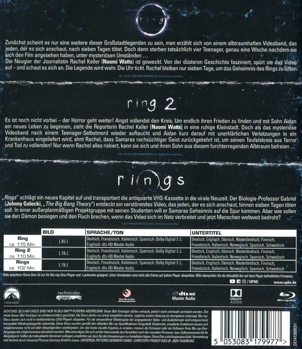 RingZunächst scheint es nur eine weitere dieser Großstadtlegenden zu sein: Man erzählt sich von einem albtraumhaften Videoband, das jeden, der es sieht, nach sieben Tagen tötet. Doch dann sterben tatsächlich vier Teenager, genau eine Woche, nachdem sie das Band gesehen haben, unter mysteriösen Umständen ... Die Neugier der Journalistin Rachel Keller (Naomi Watts) ist geweckt. Von der düsteren Geschichte fasziniert, spürt sie das Band auf - und schaut es sich an. Die Legende wird wahr. Die Uhr tickt. Rachel bleiben nur sieben Tage, um das Geheimnis des Rings zu lüften.Ring 2Es ist noch nicht vorbei - der Horror geht weiter! Angst vollendet den Kreis. "Ring 2" beweist mit beklemmender Story und schockierenden Bildern, dass er seinem Vorgänger in nichts nachsteht. Um endlich ihren Frieden zu finden und mit Sohn Aidan ein neues Leben zu beginnen, zieht die Reporterin Rachel Keller (Naomi Watts) in eine ruhige Kleinstadt. Doch als das mysteriöse Videoband nach einem Teenager-Selbstmord wieder auftaucht und Aidan kurz darauf mit unerklärlichen Verletzungen in ein Krankenhaus eingeliefert wird, ahnt Rachel, dass Samaras rachsüchtiger Geist zurückgekehrt ist, um seinen Teufelskreis aus Terror und Tod zu vollenden! Nur wenn Rachel alles riskiert, kann sie sich und ihren Sohn aus diesem furchterregenden Albtraum befreien ...Rings"Rings" schlägt ein neues Kapitel auf und transportiert die antiquierte VHS-Kassette in die virale Neuzeit. Der Biologie-Professor Gabriel...