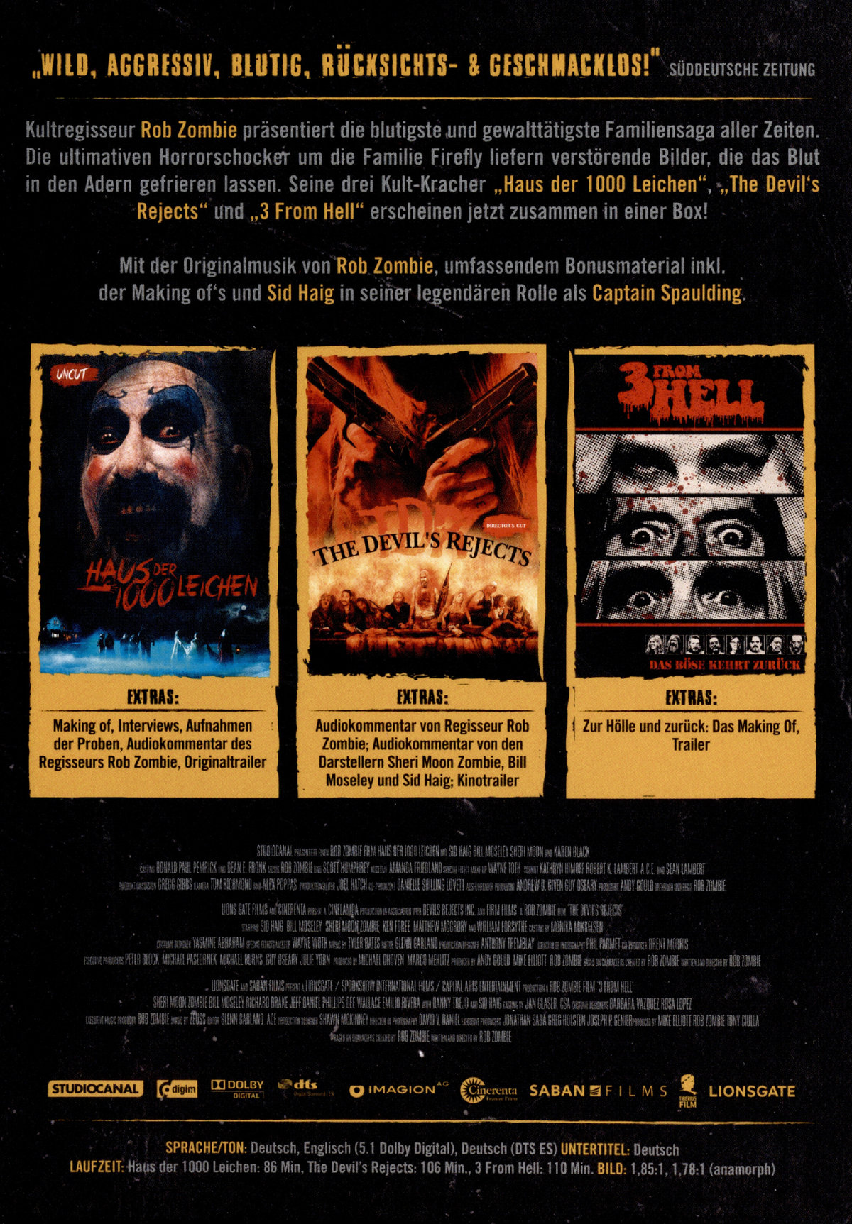 Kultregisseur Rob Zombie präsentiert in seiner Trilogie die blutgetränkteste und gewalttätigste Familiensaga aller Zeiten. Der Genre-Regisseur liefert mit verstörenden Bildern geniale Horrorschocker, die das Blut in den Adern gefrieren lassen. Jetzt gibt es seine Kult-Kracher"Haus der 1000 Leichen", "The Devil's Reject" und "3 From Hell" alle in einer Box.