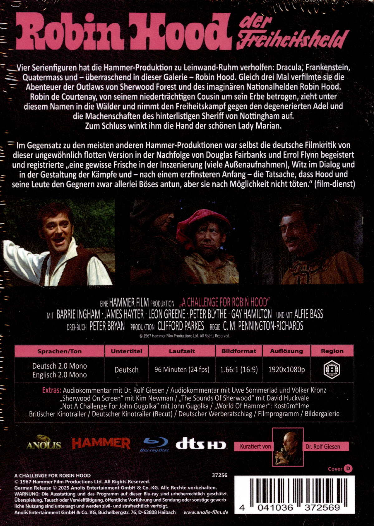 Robin de Courtenay, von seinem niederträchtigen Cousin um sein Erbe betrogen, zieht unter diesem Namen in die Wälder und nimmt den Freiheitskampf gegen den degenerierten Adel und die Machenschaften des hinterlistigen Sheriffs von Nottingham auf. Zum Schluss winkt ihm die Hand der schönen Lady Marian. Im Gegensatz zu den meisten anderen Hammer-Produktionen war selbst die deutsche Filmkritik von dieser ungewöhnlich flotten Version in der Nachfolge von Douglas Fairbanks und Errol Flynn begeistert und registrierte „eine gewisse Frische in der Inszenierung (viele Außenaufnahmen), Witz im Dialog und in der Gestaltung der Kämpfe und – nach einem erzfinsteren Anfang – die Tatsache, dass Hood und seine Leute den Gegnern zwar allerlei Böses antun, aber sie nach Möglichkeit nicht töten.“ (film-dienst).