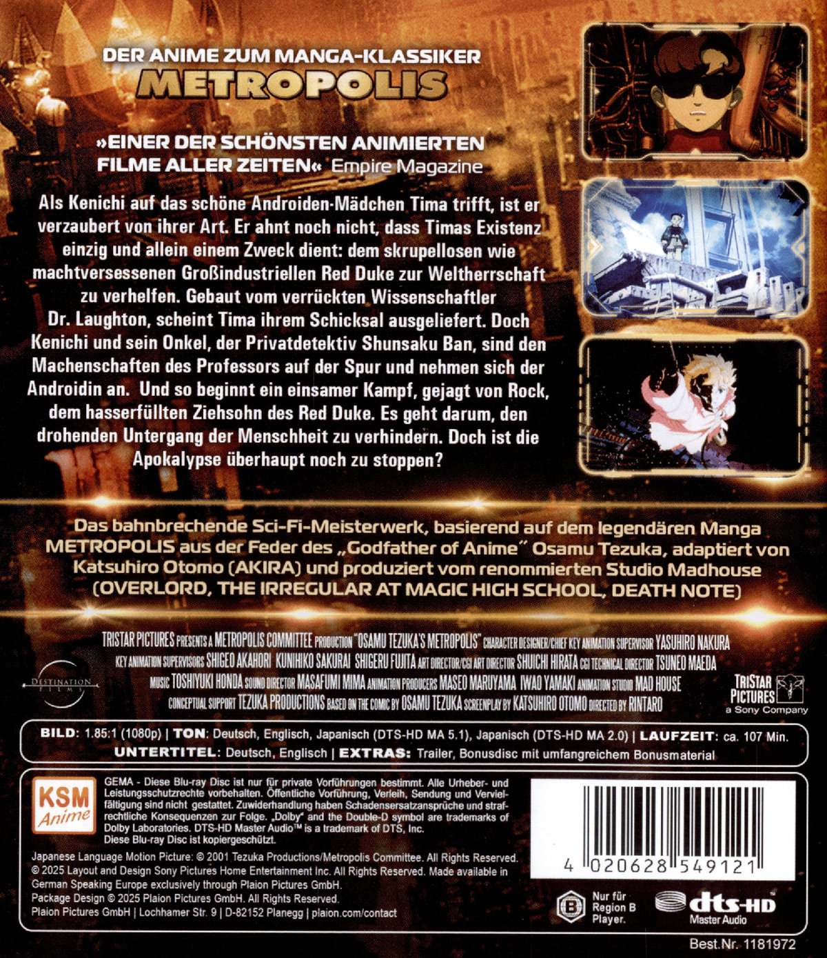 Das bahnbrechende Sci-Fi-Meisterwerk, basierend auf dem legendären Manga METROPOLIS aus der Feder des "Godfather of Anime" Osamu Tezuka, adaptiert von Katsuhiro Otomo (AKIRA) und produziert vom renommierten Studio Madhouse (DEATH NOTE, BLACK LAGOON) - erstmals auf Blu-ray!