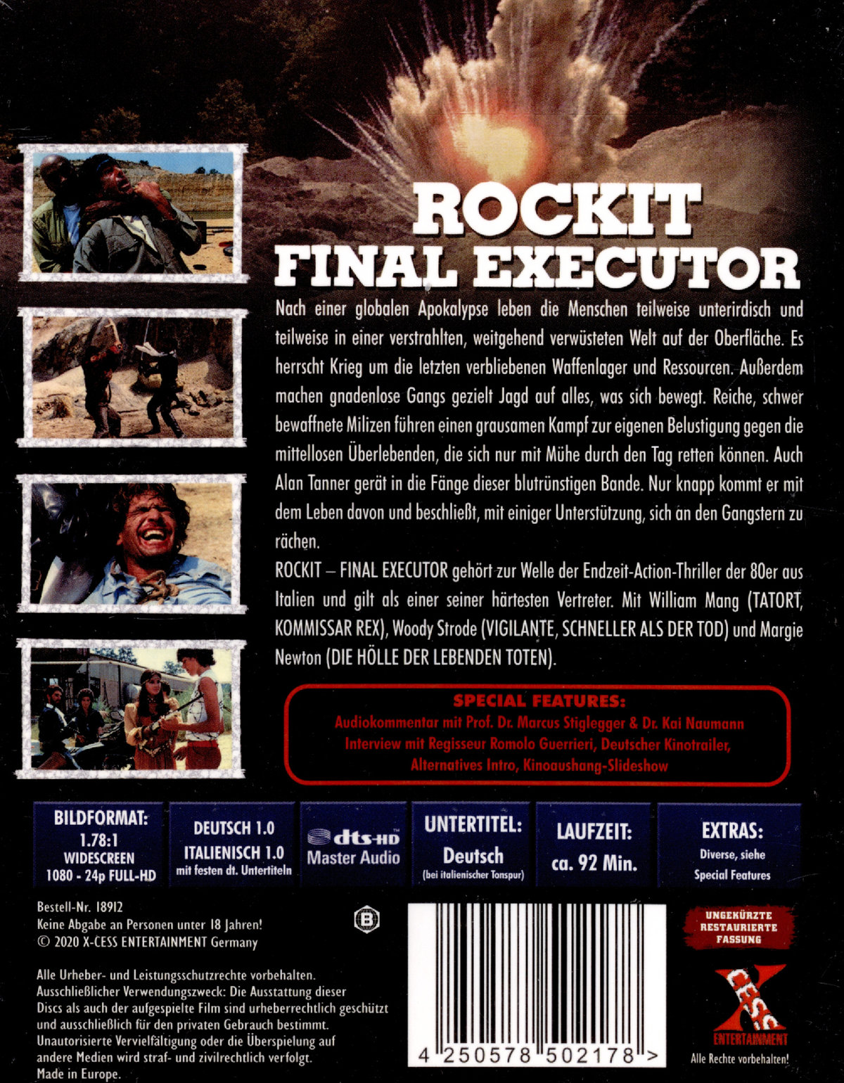 ROCKIT - FINAL EXECUTOR gehört zur Welle der Endzeit-Action-Thriller der 80er aus Italien und gilt als einer seiner härtesten Vertreter. Mit William Mang (TATORT, KOMMISSAR REX), Woody Strode (VIGILANTE, SCHNELLER ALS DER TOD) und Margie Newton (DIE HÖLLE DER LEBENDEN TOTEN).