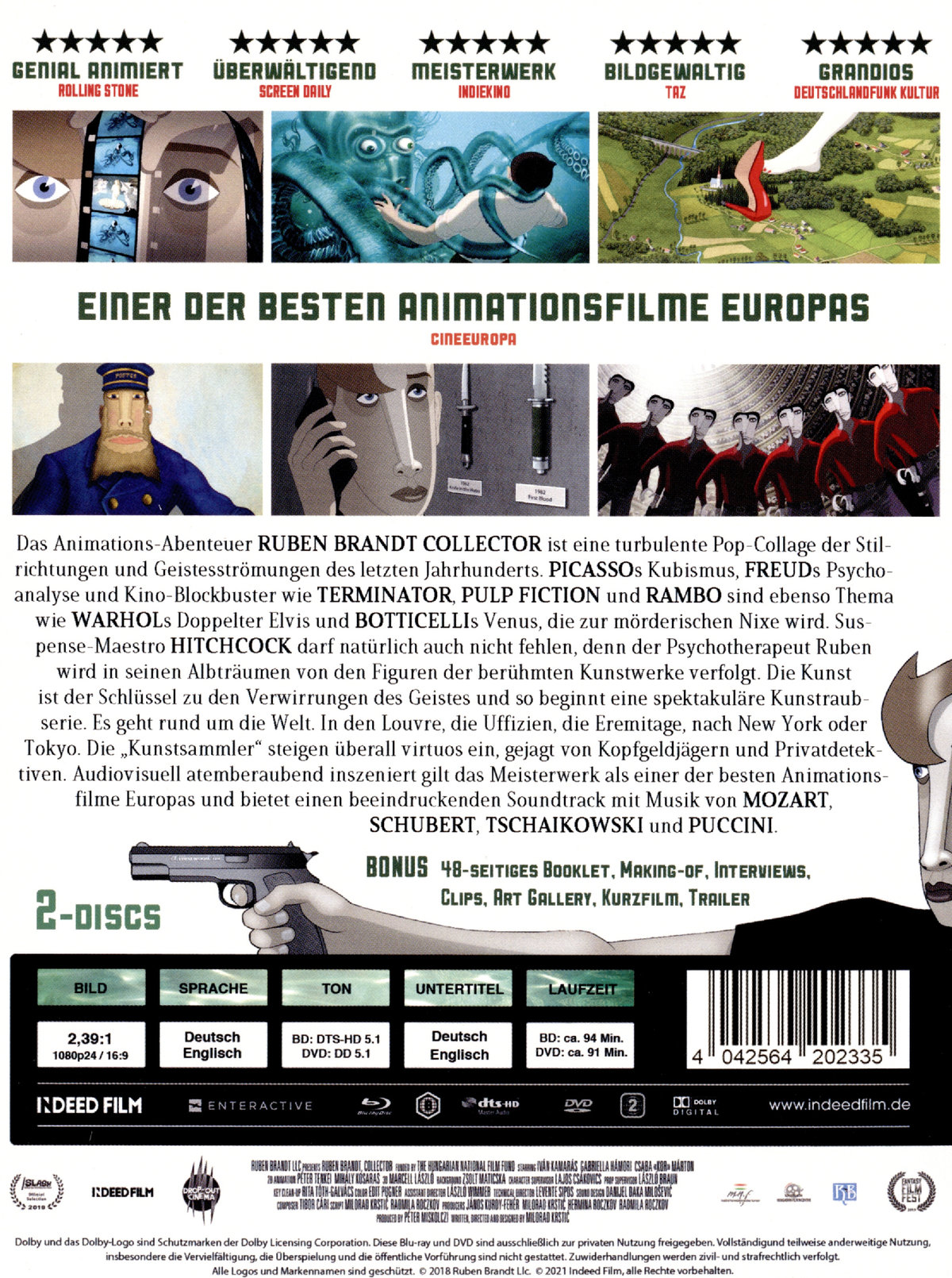 Multitalent Milorad Krstics animiertes Krimi-Abenteuer RUBEN BRANDT, COLLECTOR ist eine turbulente Pop-Collage der Stilrichtungen und Geistesströmungen des letzten Jahrhunderts. PICASSOs Kubismus, FREUDs Psychoanalyse und Kino-Blockbuster wie TERMINATOR, PULP FICTION und RAMBO sind ebenso Thema wie WARHOLs Doppelter Elvis und BOTTICELLIs Venus, die zur mörderischen Nixe wird. Suspense-Maestro HITCHCOCK darf natürlich nicht fehlen, denn der Psychotherapeut Ruben Brandt wird in seinen Albträumen von den Figuren der berühmten Kunstwerke verfolgt. Die Kunst ist der Schlüssel zu den geistigen Verwirrungen Rubens und so beginnt eine spektakuläre Kunstraubserie. Spannend und turbulent geht es rund um die Welt, in den Louvre, in die Uffizien, in die Eremitage, nach New York oder Tokyo. Die "Kunstsammler" steigen überall virtuos ein, gejagt von Kopfgeldjägern und Privatdetektiven. Humorvoll, surreal und audiovisuell atemberaubend gilt das Meisterwerk als einer der besten Animationsfilme Europas und hat zudem einen beeindruckenden Soundtrack zu bieten: u.a. mit Musik von MOZART, SCHUBERT, TSCHAIKOWSKI, PUCCINI sowie BRITNEY SPEARS und RADIOHEAD.