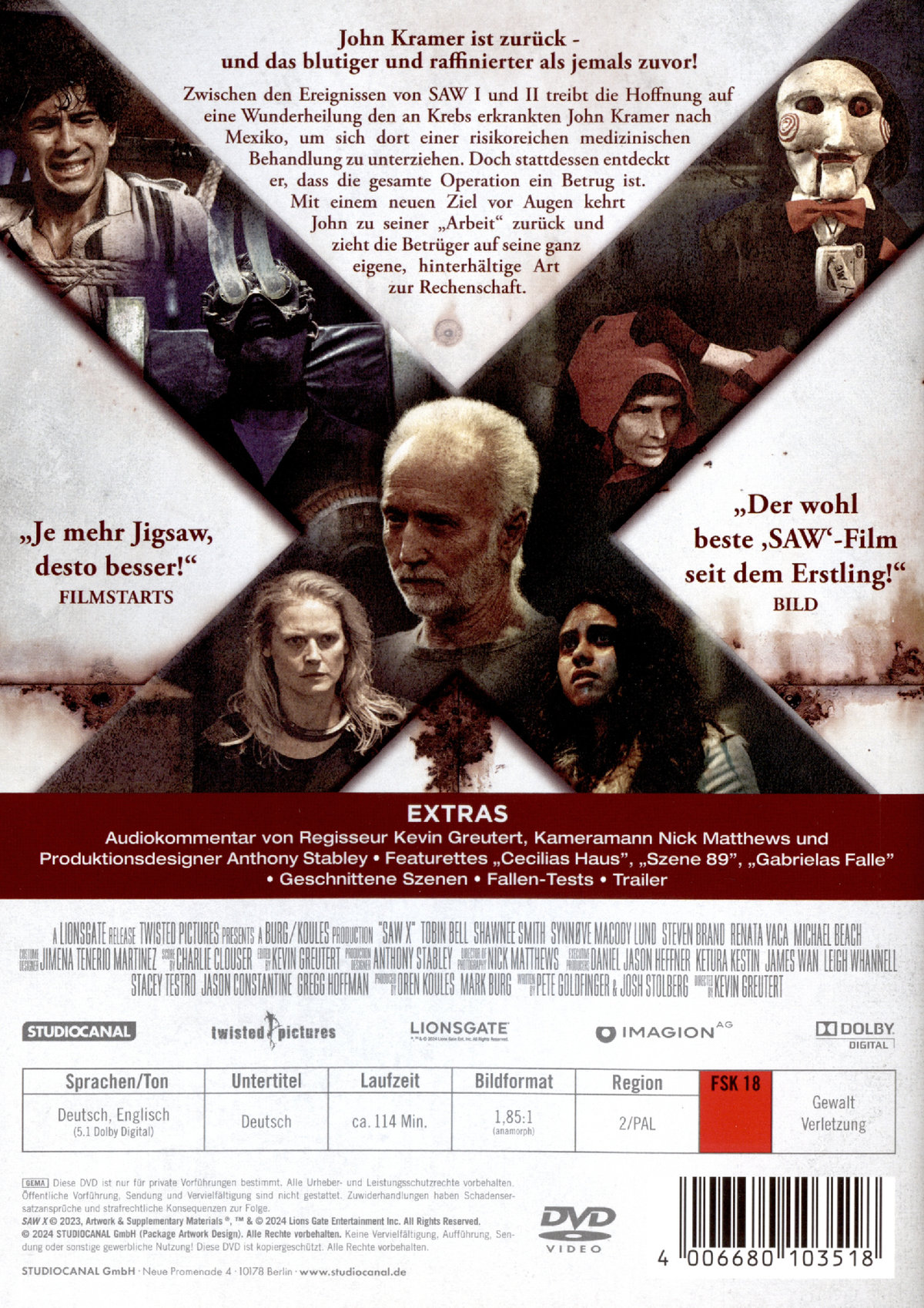 Mit SAW X kehrt das Franchise zu seinen Wurzeln zurück! Regie führt wieder Kevin Greutert, der zuvor bereits "Saw VI" und "Saw VII" inszeniert hat und darüber hinaus für den Schnitt von "Saw I-V" und "Jigsaw" verantwortlich war. Diesmal spielt sich das blutige Spiel in Mexiko ab, ein von der Fan-Community mit Spannung erwarteter neuer Standort.