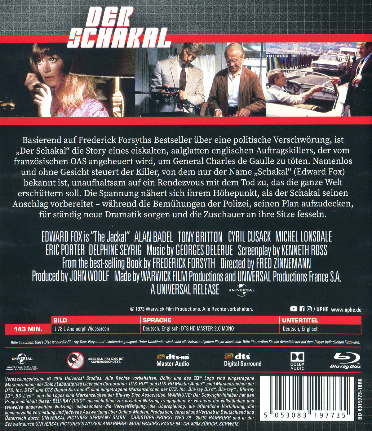 Basierend auf Frederick Forsyths Bestseller über eine politische Verschwörung, ist "Der Schakal" die Story eines eiskalten, aalglatten englischen Auftragskillers, der vom französischen OAS angeheuert wird, um General Charles de Gaulle zu töten.Namenlos und ohne Gesicht steuert der Killer, von dem nur der Name "Schakal" (Edward Fox) bekannt ist, unaufhaltsam auf ein Rendezvous mit dem Tod zu, das die ganze Welt erschüttern soll.Die Spannung nähert sich ihrem Höhepunkt, als der Schakal seinen Anschlag vorbereitet - während die Bemühungen der Polizei, seinen Plan aufzudecken, für ständig neue Dramatik sorgen und die Zuschauer an ihre Sitze fesseln.