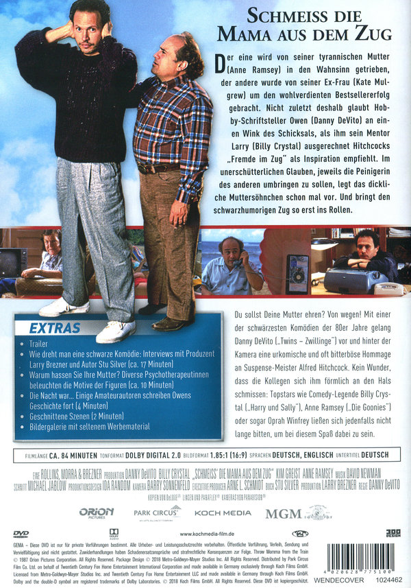 Der eine wird von seiner tyrannischen Mutter (Anne Ramsay) in den Wahnsinn getrieben, der andere wurde von seiner Ex-Frau (Kate Mulgrew) um den wohlverdienten Bestsellererfolg gebracht. Nicht zuletzt deshalb glaubt Hobby-Schriftsteller Owen (Danny DeVito) an einen Wink des Schicksals, als ihm sein Mentor Larry (Billy Crystal) ausgerechnet Hitchcocks "Fremde im Zug" als Inspiration empfiehlt. Im unerschütterlichen Glauben, jeweils die Peinigerin des anderen umbringen zu sollen, legt das dickliche Muttersöhnchen schon mal vor. Und bringt den schwarzhumorigen Zug so erst ins Rollen.
