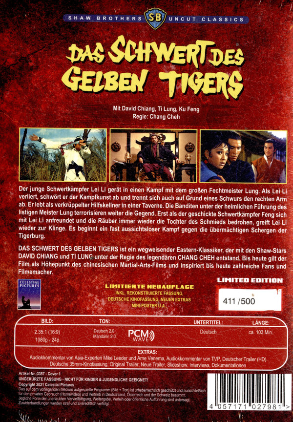 DAS SCHWERT DES GELBEN TIGERS ist ein wegweisender Eastern-Klassiker, der mit den Shaw-Stars DAVID CHIANG und TI LUNG unter der Regie des legendären CHANG CHEH entstand. Bis heute gilt der Film als Höhepunkt des chinesischen Martial-Arts-Films und inspiriert bis heute zahlreiche Fans und Filmemacher.