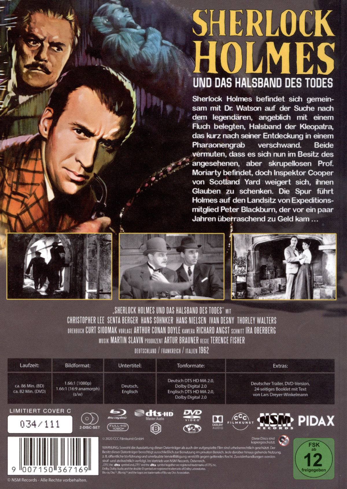s/w Das mit einem Fluch belegte Halsband von Kleopatra ist verschwunden. Scotland Yard ist auf die Hilfe von Meisterdetektiv Sherlock Holmes angewiesen. Der lässt sich von seinem Intimfeind Professor Moriarty nicht täuschen und bringt das Halsband wieder zurück ... Pidax präsentiert den Schwarzweiß-Krimi von Produzent Artur Brauner aus dem Jahr 1962. Mit dem britischen Star Christopher Lee als Sherlock Holmes, Hans Söhnker als gerissenem Professor und Senta Berger als attraktivem Blickfang. Das amüsante Detektivspiel unter Regie des Hammer-Regisseurs Terence Fisher kommt dem Reiz der Detektivabenteuer von Arthur Canon Doyle sehr nahe, da besonderer Wert auf Nervenkitzel und Krimi-Atmosphäre gelegt wird. Sherlock Holmes deutsche Stimme ist die von Harry Wüstenhagen, die sich als perfekt für den Meisterdetektiv eignet und noch weitere Holmes-Akteure begleiten wird. Fesselnde Krimiunterhaltung!