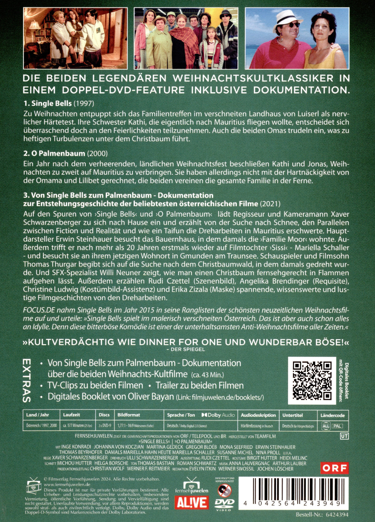 Die beiden legendären Weihnachtskultklassiker in einem Doppel-DVD-Feature inklusive Dokumentation. 1. Single Bells (1997) Zu Weihnachten entpuppt sich das Familientreffen im verschneiten Landhaus von Luiserl als nervlicher Härtetest. Ihre Schwester Kathi, die eigentlich nach Mauritius fliegen wollte, entscheidet sich überraschend doch an den Feierlichkeiten teilzunehmen. Auch die beiden Omas trudeln ein, was zu heftigen Turbulenzen unter dem Christbaum führt. 2. O Palmenbaum (2000) Ein Jahr nach dem verheerenden, ländlichen Weihnachtsfest beschließen Kathi und Jonas, Weihnachten zu zweit auf Mauritius zu verbringen. Sie haben allerdings nicht mit der Hartnäckigkeit von der Omama und Lilibet gerechnet, die beiden vereinen die gesamte Familie in der Ferne. 3. Dokumentation zur Entstehungsgeschichten der beliebtesten österreichischen Filme. Auf den Spuren von "Single Bells" und "O Palmenbaum" lädt Regisseur und Kameramann Xaver Schwarzenberger zu sich nach Hause ein und erzählt von der Suche nach Schnee, den Parallelen zwischen Fiction und Realität und wie ein Taifun die Dreharbeiten in Mauritius erschwerte. Hauptdarsteller Erwin Steinhauer besucht das Bauernhaus, indem damals die "Familie Moor" wohnte. Außerdem trifft er nach mehr als 20 Jahren erstmals wieder auf Filmtochter "Sissi" - Mariella Schaller - und besucht sie an ihrem jetzigen Wohnort in Gmunden am Traunsee. Schauspieler und Filmsohn Thomas Thurgar begibt sich auf die Suche nach dem Christbaumwald, in dem damals gedreht wurde. Und SFX-Spezialist Willi Neuner zeigt, wie man einen Christbaum fernsehgerecht in Flammen aufgehen lässt. Außerdem erzählen Rudi Czettel (Szenenbild), Angelika Brendinger (Requisite), Christine Ludwig (Kostümbild-Assistenz) und Erika Zizala (Maske) spannende, wissenswerte und lustige Filmgeschichten von den Dreharbeiten. Durch ihre alljährlichen Wiederholungen haben die beiden Filme seither Kultcharakter erreichen können. 2008 titulierte die Österreich "Wer diese beiden Satiren noch nie gesehen hat, ist selbst schuld, denn kein österreichischer Weihnachtsfilm wird jemals in Punkto Humor und Witz an Single Bells und auch dessen würdige Fortsetzung O Palmenbaum herankommen. Richtig kultverdächtig und wunderbar böse sind die Schwarzenberger-Komödien". Im selben Jahr platzierte auch die Heute den Film gemeinsam mit seinem Sequel O Palmenbaum in ihrer Liste der Top-Weihnachtsfilme und befand, dass beide Spielfilme "für Freunde heimischer Produktionen an den Weihnachtsfeiertagen nicht fehlen" dürften. "Kultverdächtig wie Dinner for One und wunderbar böse! Dieser Film sollte alle Jahre wieder auf den Gabentisch kommen," befand Der Spiegel in seiner Rezension aus dem Jahr 1998. Die TAZ bezeichnete den Film als über "Jahre hinweg einzig wirklich gute deutsche Weihnachtskomödie".