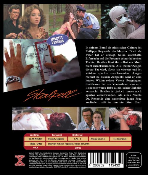 Skalpell: In seinem Beruf als plastischer Chirurg ist Philippe Reynolds ein Meister. Doch als Vater hat er versagt. Seine krankhafte Eifersucht auf die Freunde seiner hübschen Tochter Heather lässt ihn selbst vor Mord nicht zurückschrecken. Als Heather Zeugin dieser Tat wird, flieht sie entsetzt und ist seitdem spurlos verschwunden. Ausgerechnet zu diesem Zeitpunkt wird er vom letzten Willen seines Vaters übergangen. Stattdessen hat der Verstorbene sein millionenschweres Erbe allein seiner Enkelin vermacht. Heather ist jedoch immer noch spurlos verschwunden. Als eines Nachts Dr. Reynolds eine namenlose junge Frau vorfindet, deren ganzes Gesicht nach Misshandlungen bis zur Unkenntlichkeit entstellt ist, reift in ihm ein verbrecherischer Plan voller Mord und Gier!