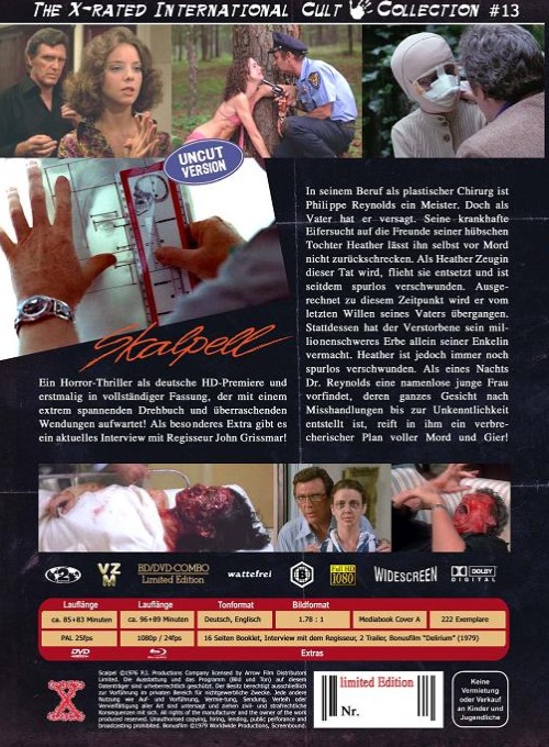 Skalpell: In seinem Beruf als plastischer Chirurg ist Philippe Reynolds ein Meister. Doch als Vater hat er versagt. Seine krankhafte Eifersucht auf die Freunde seiner hübschen Tochter Heather lässt ihn selbst vor Mord nicht zurückschrecken. Als Heather Zeugin dieser Tat wird, flieht sie entsetzt und ist seitdem spurlos verschwunden. Ausgerechnet zu diesem Zeitpunkt wird er vom letzten Willen seines Vaters übergangen. Stattdessen hat der Verstorbene sein millionenschweres Erbe allein seiner Enkelin vermacht. Heather ist jedoch immer noch spurlos verschwunden. Als eines Nachts Dr. Reynolds eine namenlose junge Frau vorfindet, deren ganzes Gesicht nach Misshandlungen bis zur Unkenntlichkeit entstellt ist, reift in ihm ein verbrecherischer Plan voller Mord und Gier!