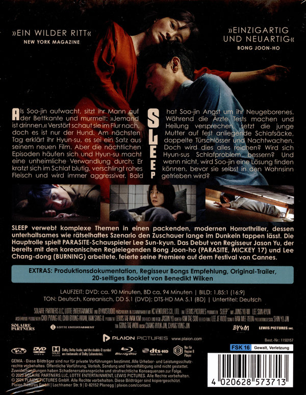 Als Soo-jin aufwacht, sitzt ihr Mann auf der Bettkante und murmelt: „Da ist jemand!“ Verstört schaut sie im Flur nach, doch es ist nur der Hund. Am nächsten Tag erklärt ihr Hyun-su, es sei ein Satz aus seinem neuen Film. Aber die nächtlichen Episoden häufen sich und Hyun-su macht eine unheimliche Verwandlung durch: Er kratzt sich im Schlaf blutig, verschlingt rohes Fleisch und wird immer aggressiver. Bald hat Soo-jin Angst um ihr Neugeborenes. Während die Ärzte Tests machen und Heilung versprechen, setzt die junge Mutter auf fest anliegende Schlafsäcke, doppelte Türschlösser und Nachtwachen. Das alles kann nicht mit rechten Dingen zugehen! SLEEP verwebt komplexe Themen in einen packenden, modernen Horrorthriller, dessen unterhaltsames wie rätselhaftes Szenario uns lange im Dunkeln tappen lässt. Die Hauptrolle spielt PARASITE-Schauspieler Lee Sun-kyun. Der Debut von Regisseur Jason Yu, der bereits mit den koreanischen Regielegenden Bong Joon-ho (MICKEY 17) und Lee Chang-dong (BURNING) arbeitete, feierte seine Premiere auf dem Festival von Cannes. (1 Blu-ray + 1 DVD)