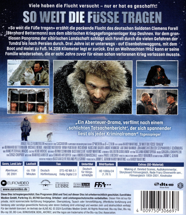 So weit die Füße tragen erzählt die packende Flucht des deutschen Soldaten Clemens Forell (Bernhard Bettermann) aus dem sibirischen Kriegsgefangenenlager Kap Deshnev. Vor dem grandiosen Panorama der sibirischen Landschaft schlägt sich Forell durch die vielen Gefahren der Tundra bis nach Persien durch. Drei Jahre ist er unterwegs - auf Eisenbahnwaggons, mit dem Boot und meist zu Fuß. 14.208 Kilometer legt er zurück. Erst an Weihnachten 1952 kann er seine Familie wiedersehen, die er acht Jahre zuvor für einen schon verlorenen Krieg verlassen musste.