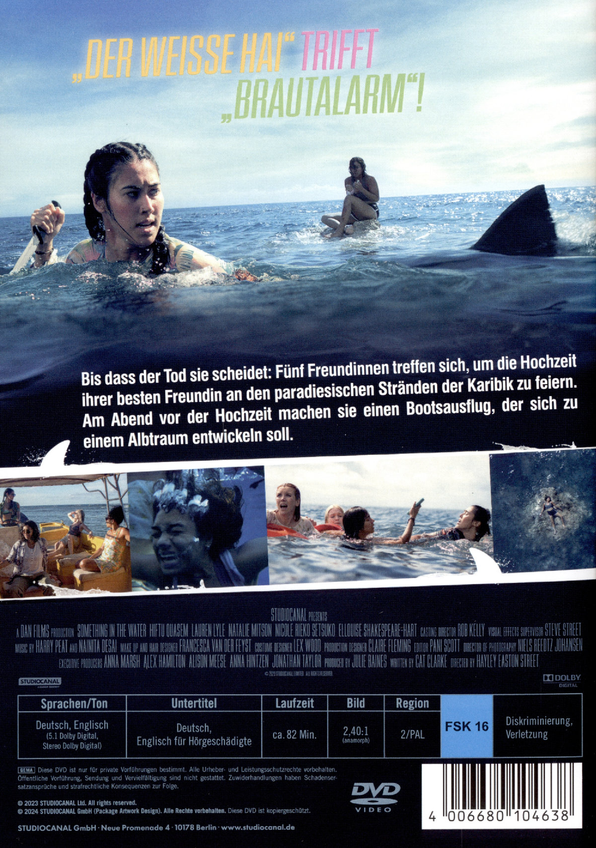 Die Freundinnen Meg, Cam, Kayla und Ruth sind auf die Hochzeit ihrer besten Freundin Lizzie in die Karibik eingeladen. Als spontan die Idee aufkommt, am Vortag der Hochzeit mit dem Boot zu einem Mädels-Trip auf eine einsame Insel aufzubrechen, wissen sie nicht, was sie erwartet. Kurz nach der Ankunft im Paradies wird Ruth beim Schwimmen von einem Hai angegriffen – panisch versuchen die Freundinnen, sie zurück ans Festland zu bringen. Nur, um kurze Zeit später festzustellen, dass das gemietete Boot ein Leck hat – mitten auf dem Ozean, ohne Land in Sicht. Blut sickert ins Wasser und die Bahnen der sie umkreisenden Haie werden immer enger: Ein rasanter und blutiger Wettlauf gegen die Zeit beginnt… SOMETHING IN THE WATER ist ein Hai-Survival-Thriller vom Feinsten! In Hayley Easton Streets Debütfilm spielen Hiftu Quasem („Ten Percent“), Lauren Lyle („Outlander“), Nicole Rieko Setsuko („Eavesdropping“), Ellouise Shakespeare-Hart („One Four Three“) sowie Natalie Mitson („The Larkins“) fünf Freundinnen, die vor der idyllischen Kulisse der Dominikanischen Republik ums nackte Überleben kämpfen.