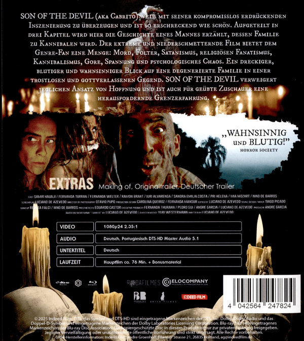 Lateinamerikanischer Extrem-Horror für Hartgesottene! Eine surreale und kontroverse Reise in die dunkelsten Abgründe des Menschen. Der lateinamerikanische Horrorfilm ist in den letzten Jahren immer wieder ein Garant für wahre Genre-Highlights wie TIGERS ARE NOT AFRAID oder WHEN EVIL LURKS. Auch der brasilianische SON OF THE DEVIL (aka Cabrito) weiß mit seiner kompromisslos erdrückenden Inszenierung zu überzeugen und ist so erschreckend wie schön. Aufgeteilt in drei Kapitel wird hier die Geschichte eines Mannes erzählt, dessen Familie zu Kannibalen wird. Der extreme und niederschmetternde Film bietet dem Genre-Fan eine Menge: Mord, Folter, Satanismus, religiöser Fanatismus, Kannibalismus, Gore, Spannung und psychologisches Chaos. Ein dreckiger, blutiger und wahnsinniger Blick auf eine degenerierte Familie in einer trostlosen und gottverlassenen Gegend. SON OF THE DEVIL verweigert jeglichen Ansatz von Hoffnung und ist auch für geübte Zuschauer eine herausfordernde Grenzerfahrung.