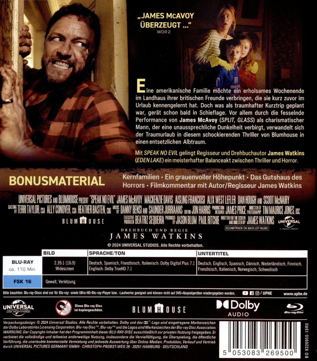 Eine amerikanische Familie möchte ein erholsames Wochenende im Landhaus ihrer britischen Freunde verbringen, die sie kurz zuvor im Urlaub kennengelernt hat. Doch was als traumhafter Kurztrip geplant war, gerät schon bald in Schieflage. Angeführt von einer fesselnden Performance von James McAvoy (Split, Glass) als charismatischer Mann, der eine unaussprechliche Dunkelheit verbirgt, verwandelt sich der Traumurlaub in diesem schockierenden Thriller von Blumhouse, in einen entsetzlichen Albtraum. Mit "Speak No Evil" gelingt Regisseur und Drehbuchautor James Watkins (Eden Lake) ein meisterhafter Balanceakt zwischen Thriller und Horror.
