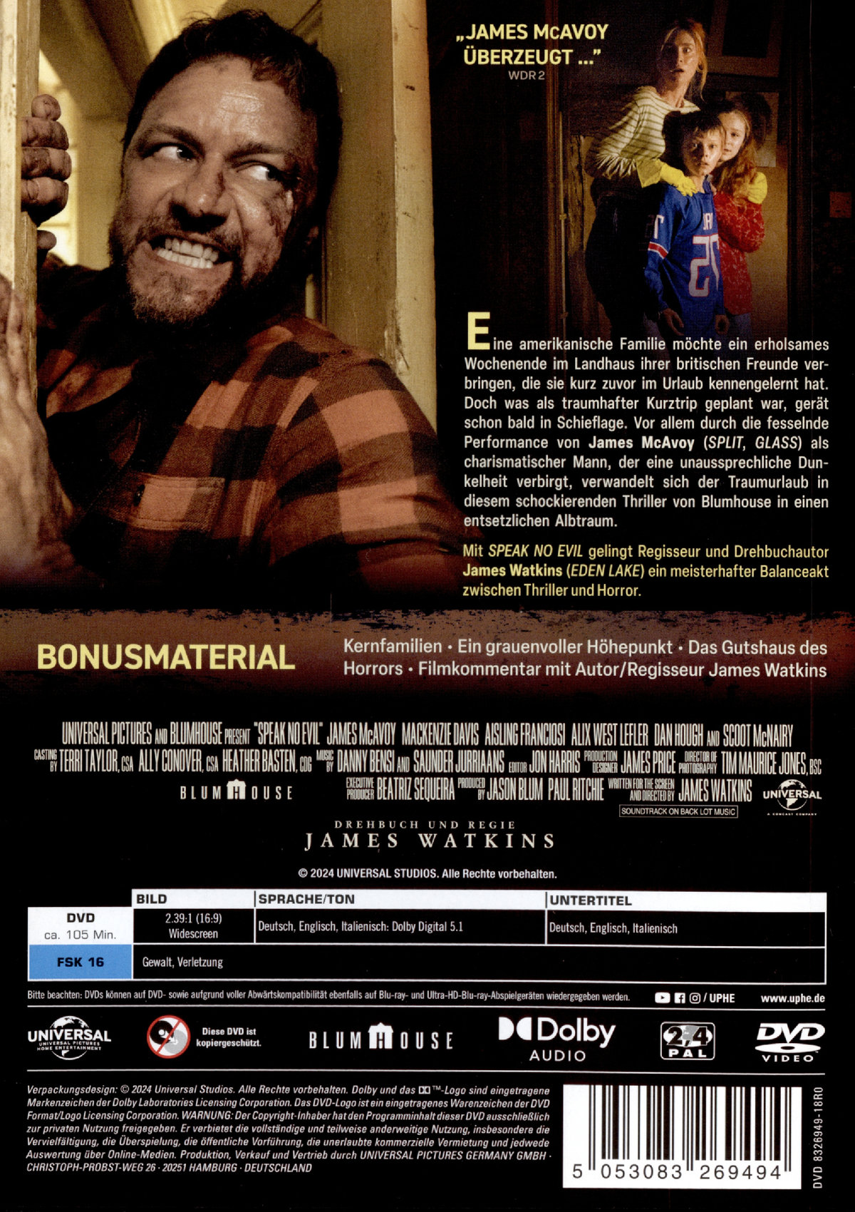 Eine amerikanische Familie möchte ein erholsames Wochenende im Landhaus ihrer britischen Freunde verbringen, die sie kurz zuvor im Urlaub kennengelernt hat. Doch was als traumhafter Kurztrip geplant war, gerät schon bald in Schieflage. Angeführt von einer fesselnden Performance von James McAvoy (Split, Glass) als charismatischer Mann, der eine unaussprechliche Dunkelheit verbirgt, verwandelt sich der Traumurlaub in diesem schockierenden Thriller von Blumhouse, in einen entsetzlichen Albtraum. Mit "Speak No Evil" gelingt Regisseur und Drehbuchautor James Watkins (Eden Lake) ein meisterhafter Balanceakt zwischen Thriller und Horror.