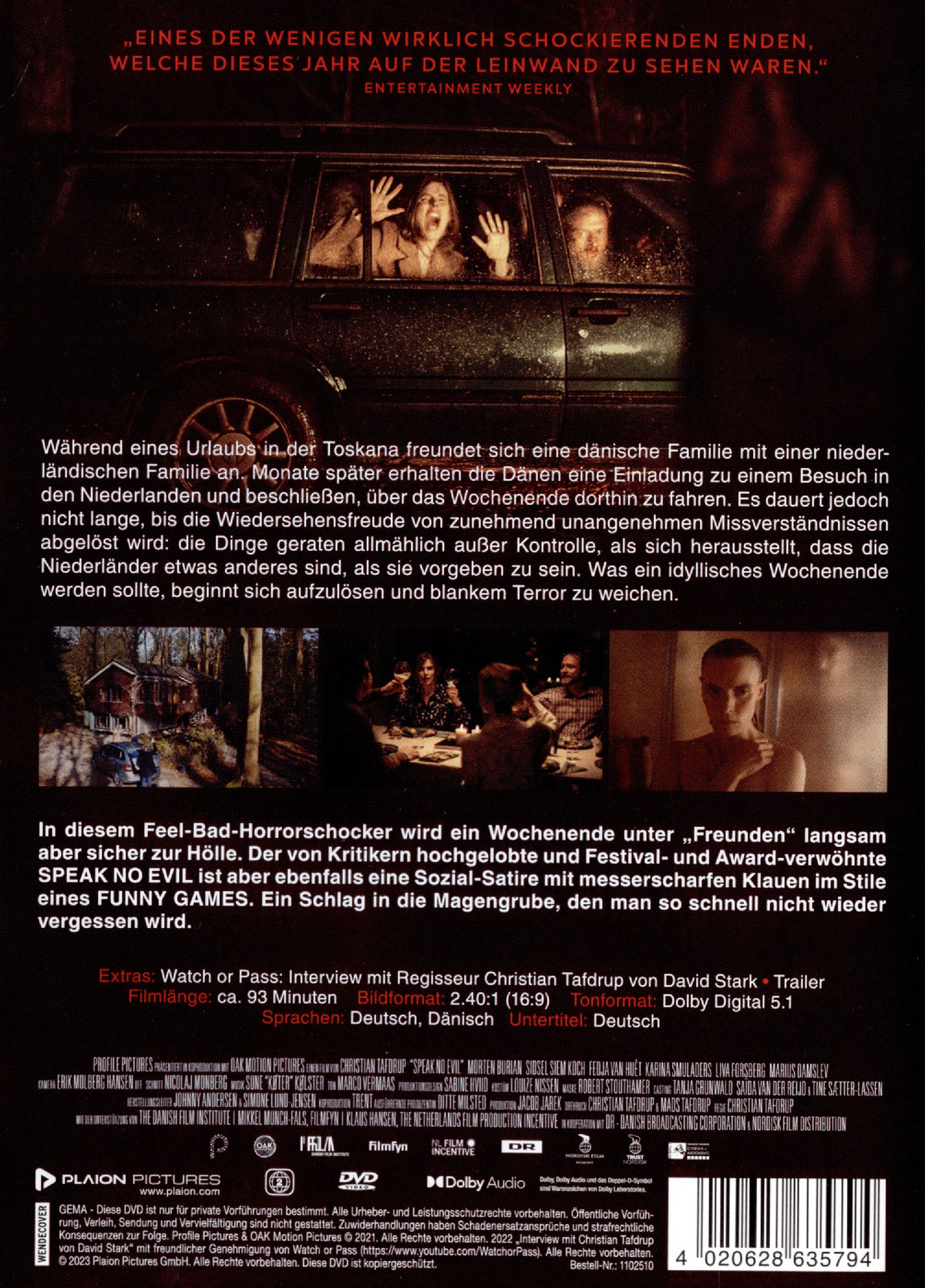 In diesem Feel-Bad-Horrorschocker wird ein Wochenende unter "Freunden" langsam aber sicher zur Hölle. Der von Kritikern hochgelobte und Festival- und Award-verwöhnte SPEAK NO EVIL ist aber ebenfalls eine Sozial-Satire mit messerscharfen Klauen im Stile eines FUNNY GAMES. Ein Schlag in die Magengrube, den man so schnell nicht wieder vergessen wird.