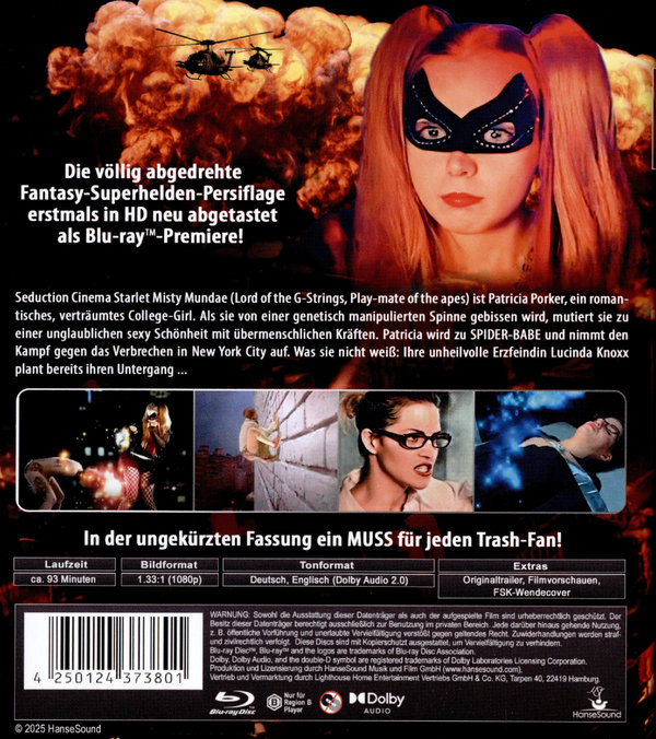 Seduction Cinema-Starlet Misty Mundae ("Lord of the G-Strings", "Playmate of the Apes") ist Patricia Porker, ein romantisches, verträumtes College-Girl. Als sie von einer genetisch manipulierten Spinne gebissen wird, mutiert sie zu einer unglaublichen sexy Schönheit mit übermenschlichen Kräften! Patricia wird zu SPIDERBABE und nimmt den Kampf gegen das Verbrechen in New York City auf. Was sie nicht weiß: Ihre unheilvolle Erzfeindin Lucinda Knoxx plant bereits ihren Untergang ...
