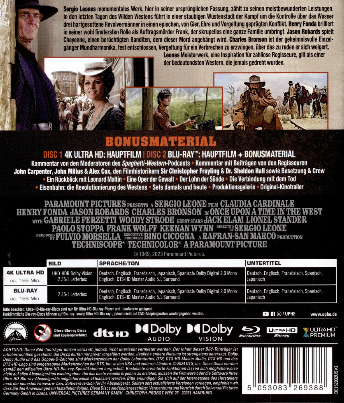 Sergio Leones monumentales Werk, hier in seiner ursprünglichen Fassung, zählt zu seinen meistbewunderten Leistungen.In den letzten Tagen des Wilden Westens führt in einer staubigen Wüstenstadt der Kampf um die Kontrolle über Wasser drei hartgesottene Revolvermänner in einen epischen Konflikt, geprägt von Gier, Ehre und Vergeltung.Henry Fonda brilliert in seiner wohl finstersten Rolle als Frank, ein Auftragsmörder, der skrupellos eine ganze Familie umbringt. Jason Robards spielt Cheyenne, einen berüchtigten Banditen, dem dieser Mord angehängt wird. Charles Bronson ist der geheimnisvolle Einzelgänger Harmonica, fest entschlossen, Vergeltung für ein Verbrechen zu erzwingen, über das er sich weigert zu reden.Leones Meisterwerk, eine Inspiration für zahllose Regisseure, gilt als einer der bedeutendsten Western, die jemals gedreht wurden.
