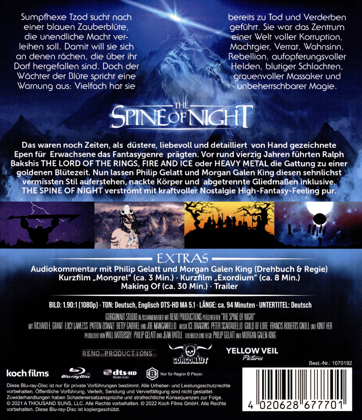 Das waren noch Zeiten, als düstere, liebevoll und detailliert von Hand gezeichnete Epen für Erwachsene das Fantasygenre prägten. Vor rund vierzig Jahren führten Ralph Bakshis THE LORD OF THE RINGS, FIRE AND ICE oder HEAVY METAL die Gattung zu einer goldenen Blütezeit. Nun lassen Philip Gelatt und Morgan Galen King diesen sehnlichst vermissten Stil auferstehen, nackte Körper und abgetrennte Gliedmaßen inklusive. THE SPINE OF NIGHT verströmt mit kraftvoller Nostalgie High-Fantasy-Feeling pur.