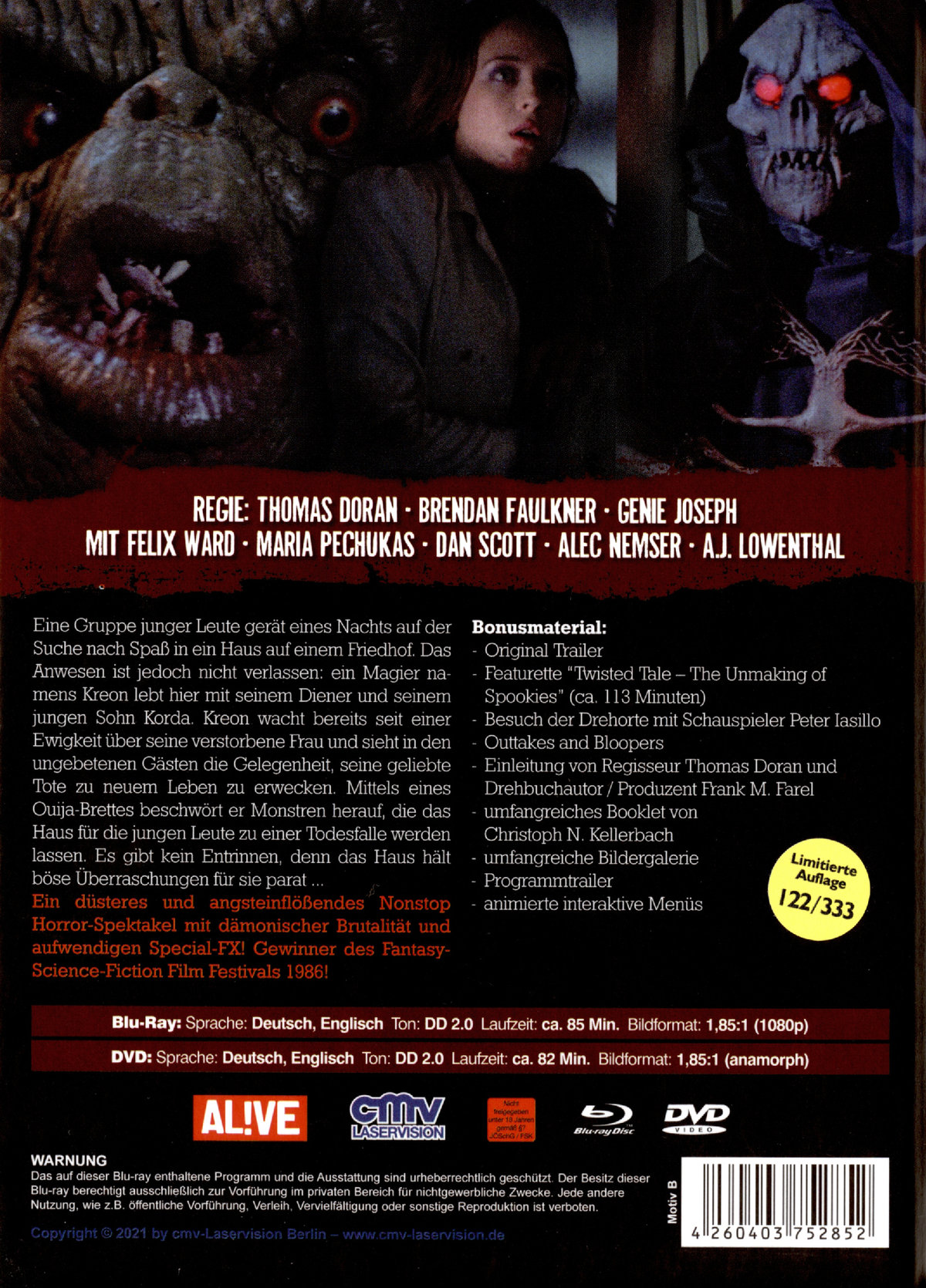 Original Trailer; Featurette “Twisted Tale; The Unmaking of Spookies” (ca. 113 Minuten);Besuch der Drehorte mit Schauspieler Peter Iasillo;Outtakes and Bloopers;Einleitung von Regisseur Thomas Doran und Drehbuchautor/Produzent Frank M. Farel;umfangreiche Bildergalerie; Programmtrailer; animierte interaktive Menüs;Booklet;