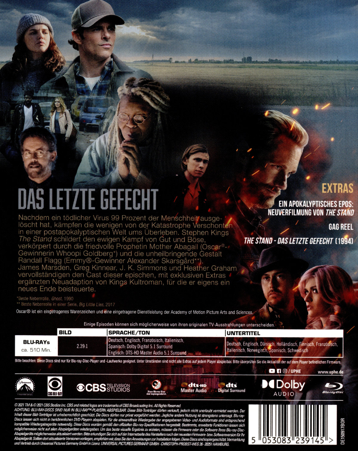 Das letzte Gefecht - Nachdem ein tödlicher Virus 99 Prozent der Menschheit ausgelöscht hat, kämpfen die wenigen von der Katastrophe Verschonten in einer postapokalyptischen Welt ums Überleben. Stephen Kings "The Stand" schildert den ewigen Kampf von Gut und Böse, verkörpert durch die friedvolle Prophetin Mother Abagail (Oscar®-Gewinnerin Whoopi Goldberg) und die unheilbringende Gestalt Randall Flagg (Emmy®-Gewinner Alexander Skarsgård).
