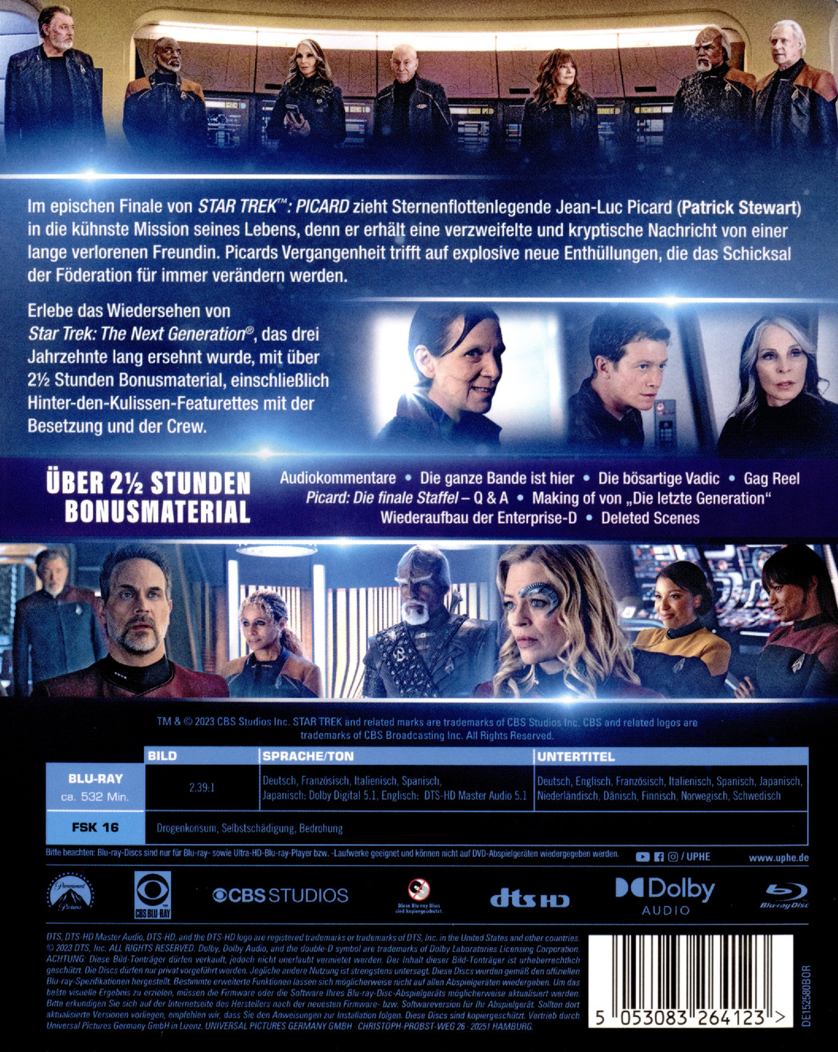 Im epischen Finale von "Star Trek: Picard" zieht eine kryptische und verzweifelte Nachricht von einer lange verlorenen Freundin, Sternenflottenlegende Admiral Jean-Luc Picard (Patrick Stewart) in die kühnste Mission seines Lebens. Das Erbe von Picards Vergangenheit trifft auf explosive neue Enthüllungen, die das Schicksal der Föderation für immer verändern werden.Erlebe das Wiedersehen von "Star Trek: The Next Generation", das drei Jahrzehnte lang ersehnt wurde mit über 2½ Stunden Bonusmaterial, einschließlich Hinter-den-Kulissen-Featurettes mit der Besetzung und der Crew.10 Episoden auf 6 DVDs bzw. 3 Blu-raysEpisodenübersicht- Die nächste Generation- Abgezogen- 17 Sekunden- Die Pattsituation- Wechselbälger- Die Bounty- Dominion- Unterwerfung- Võx- Die letzte Generation
