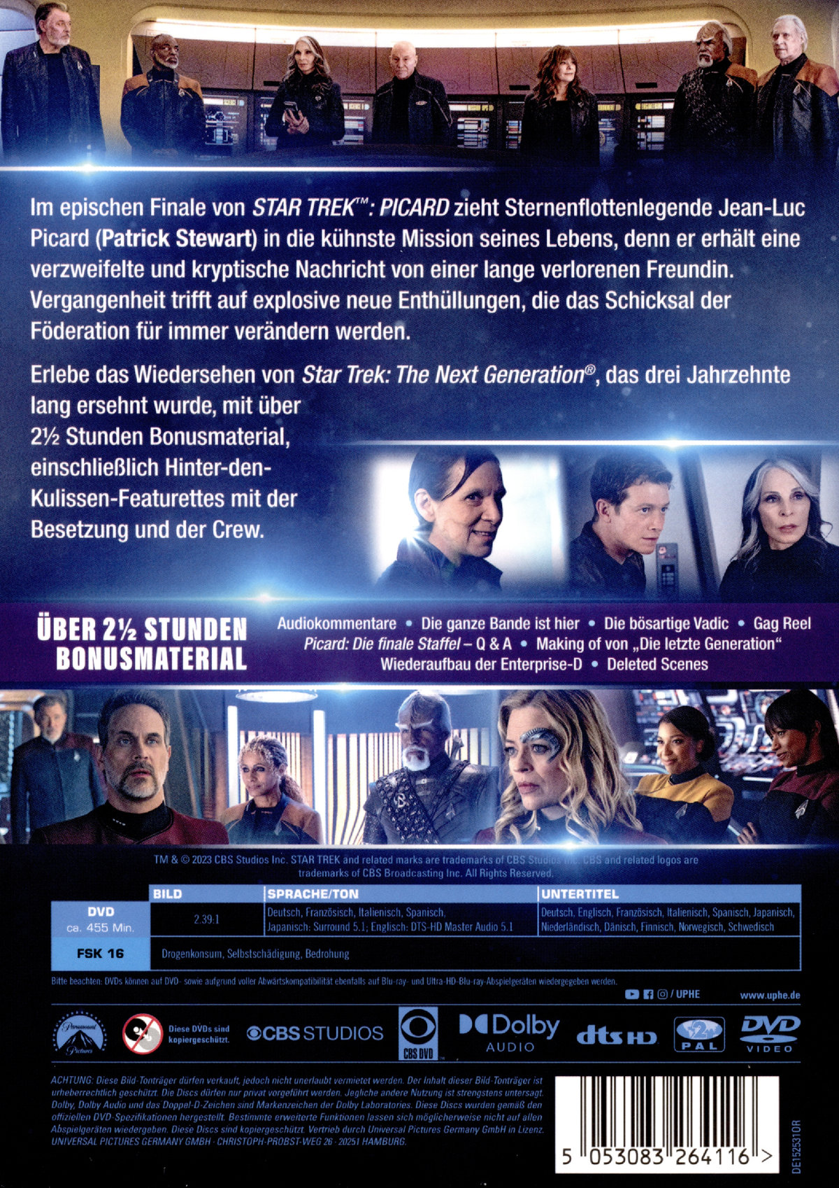 Im epischen Finale von "Star Trek: Picard" zieht eine kryptische und verzweifelte Nachricht von einer lange verlorenen Freundin, Sternenflottenlegende Admiral Jean-Luc Picard (Patrick Stewart) in die kühnste Mission seines Lebens. Das Erbe von Picards Vergangenheit trifft auf explosive neue Enthüllungen, die das Schicksal der Föderation für immer verändern werden.Erlebe das Wiedersehen von "Star Trek: The Next Generation", das drei Jahrzehnte lang ersehnt wurde mit über 2½ Stunden Bonusmaterial, einschließlich Hinter-den-Kulissen-Featurettes mit der Besetzung und der Crew.10 Episoden auf 6 DVDs bzw. 3 Blu-raysEpisodenübersicht- Die nächste Generation- Abgezogen- 17 Sekunden- Die Pattsituation- Wechselbälger- Die Bounty- Dominion- Unterwerfung- Võx- Die letzte Generation