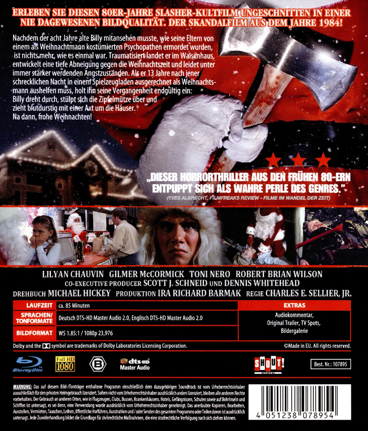 Nachdem der acht Jahre alte Billy mitansehen musste, wie seine Eltern von einem als Weihnachtmann kostümierten Psychopathen ermordet wurden, ist nichts mehr, wie es einmal war. Traumatisiert landet er im Waisenhaus, entwickelt eine tiefe Abneigung gegen die Weihnachtszeit und leidet unter immer stärker werdenden Angstzuständen. Als er 13 Jahre nach jener schrecklichen Nacht in einem Spielzeugladen ausgerechnet als Weihnachtsmann aushelfen muss, holt ihn seine Vergangenheit endgültig ein: Billy dreht durch, stülpt sich die Zipfelmütze über und zieht blutdurstig mit einer Axt um die Häuser. Na dann, frohe Weihnachten!