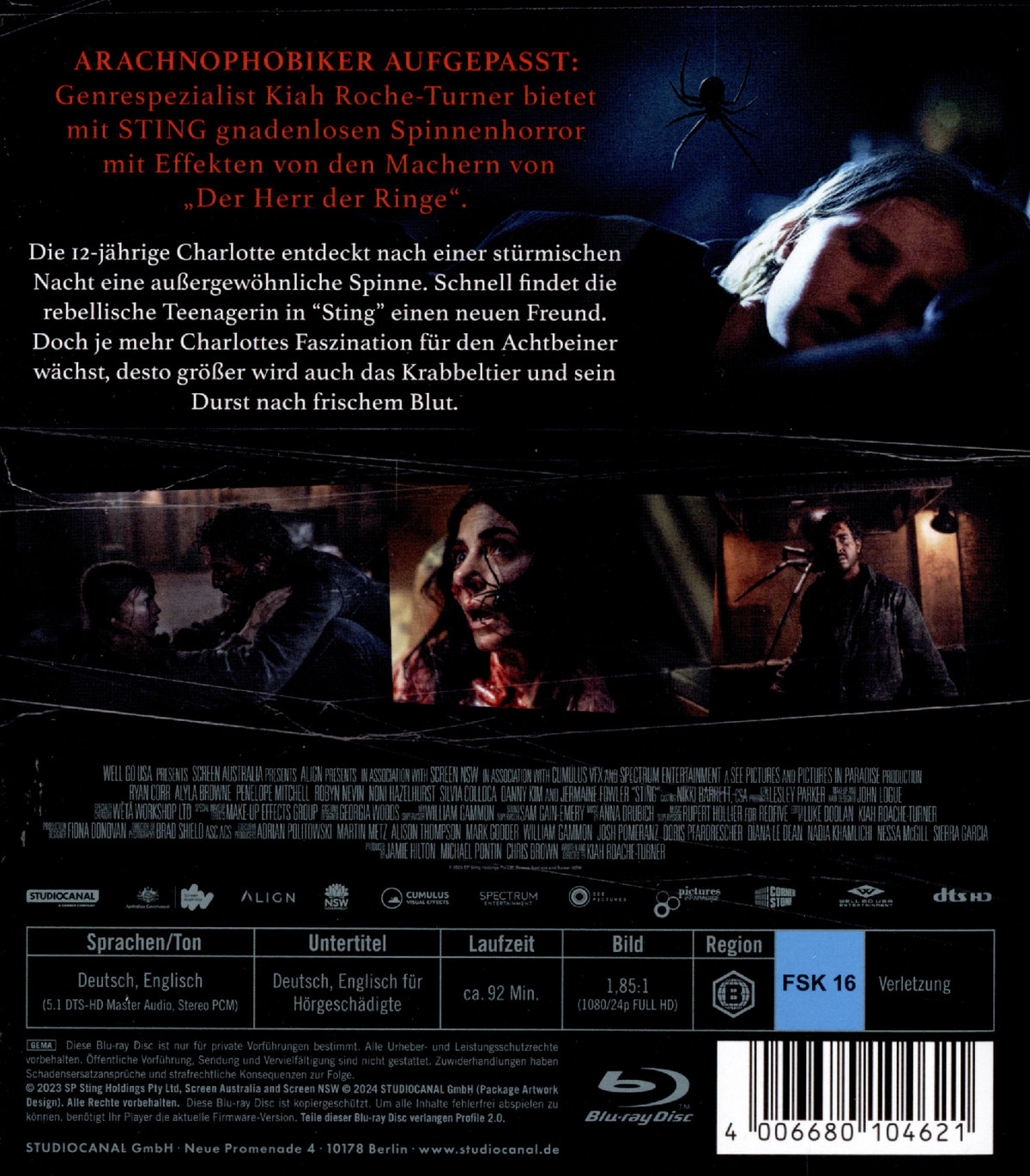 STING wurde produziert von Jamie Hilton und Michael Pontin über See Pictures zusammen mit Chris Brown von Pictures in Paradise mitKo-Finanzierung durch create NSW, cumulous VFX und Spectrum Entertainment. Die Special Effects kommen vom fünffachen Oscar®-Gewinner Weta Workshop unter der Leitung von Creative Director Richard Taylor („Blade Runner 2049“, „King Kong“, „Der Herr der Ringe“-Trilogie).