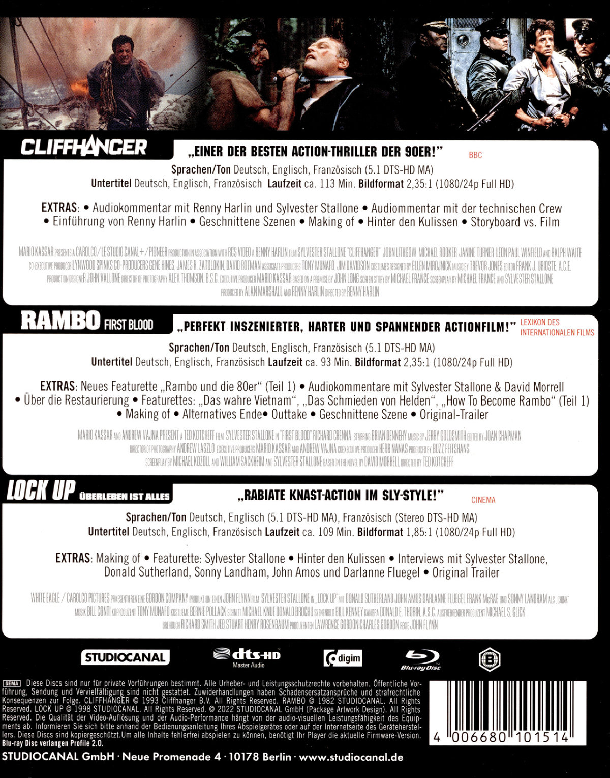 Actionlegende Sylvester Stallone in drei seiner besten Rollen! Stallone überzeugt in seinen Filmen als tougher Action-Held und einsamer Kämpfer: Sei es als Ex-Soldat John RAMBO, der sich gegen einen tyrannischen Sheriff behaupten muss, Als Musterhäftling Frank Leone in LOCK UP, der im Hochsicherheitsgefängnis vom dortigen Gefängnisdirektor tyrannisiert wird oder als ehemals bester Mann einer Bergwacht in den Rocky Mountains, der in CLIFFHANGER nach einem Flugzeugabsturz in die Gipfel zurückkehrt ... Sylvester Stallone lässt seine Zuschauer immer wieder einen Adrenalinkick spüren. (3 Blu-rays)