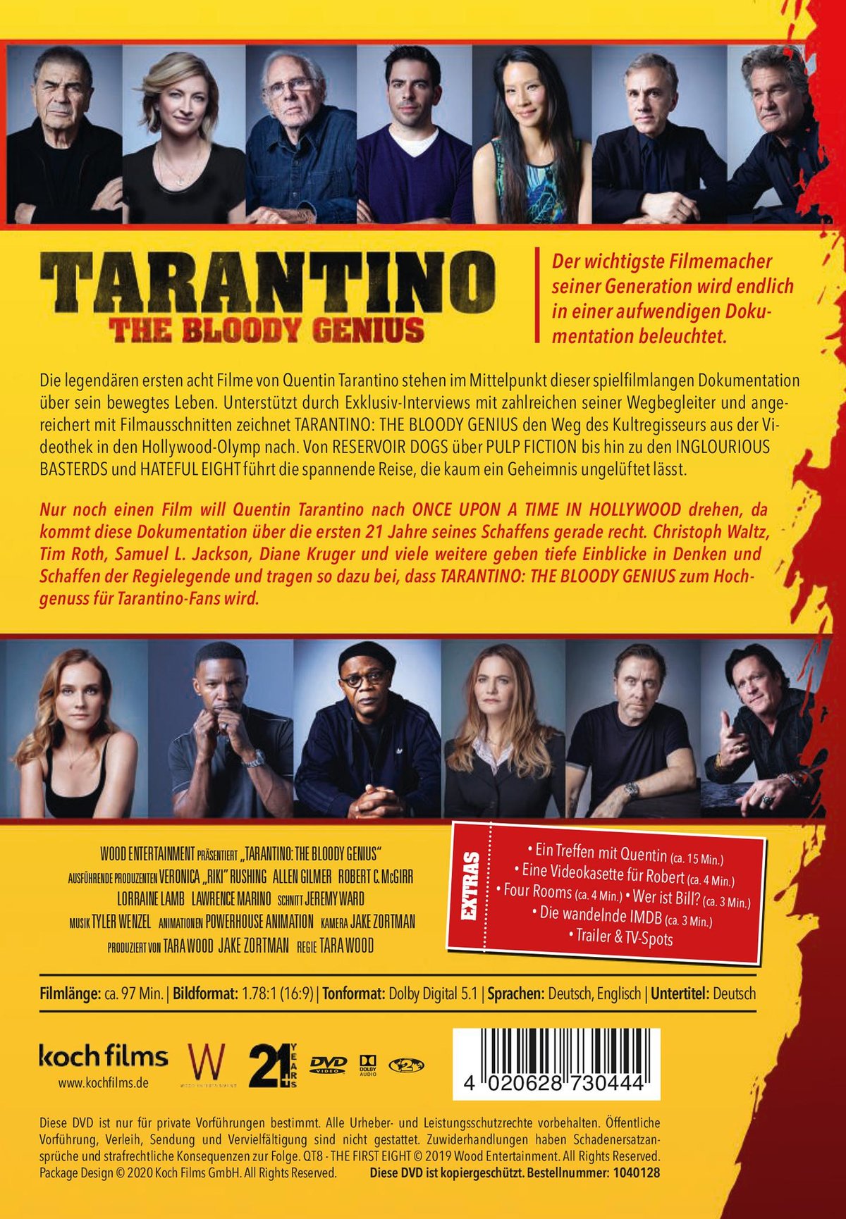 Die legendären ersten acht Filme von Quentin Tarantino stehen im Mittelpunkt dieser spielfilmlangen Dokumentation über sein bewegtes Leben. Unterstützt durch Exklusiv-Interviews mit zahlreichen seiner Wegbegleiter und angereichert mit Filmausschnitten zeichnet TARANTINO: THE BLOODY GENIUS den Weg des Kultregisseurs aus der Videothek in den Hollywood-Olymp nach. Von RESERVOIR DOGS über PULP FICTION bis hin zu den INGLORIOUS BASTERDS und HATEFUL EIGHT führt die spannende Reise, die kaum ein Geheimnis von Tarantinos Erfolg ungelüftet lässt. (1 DVD)