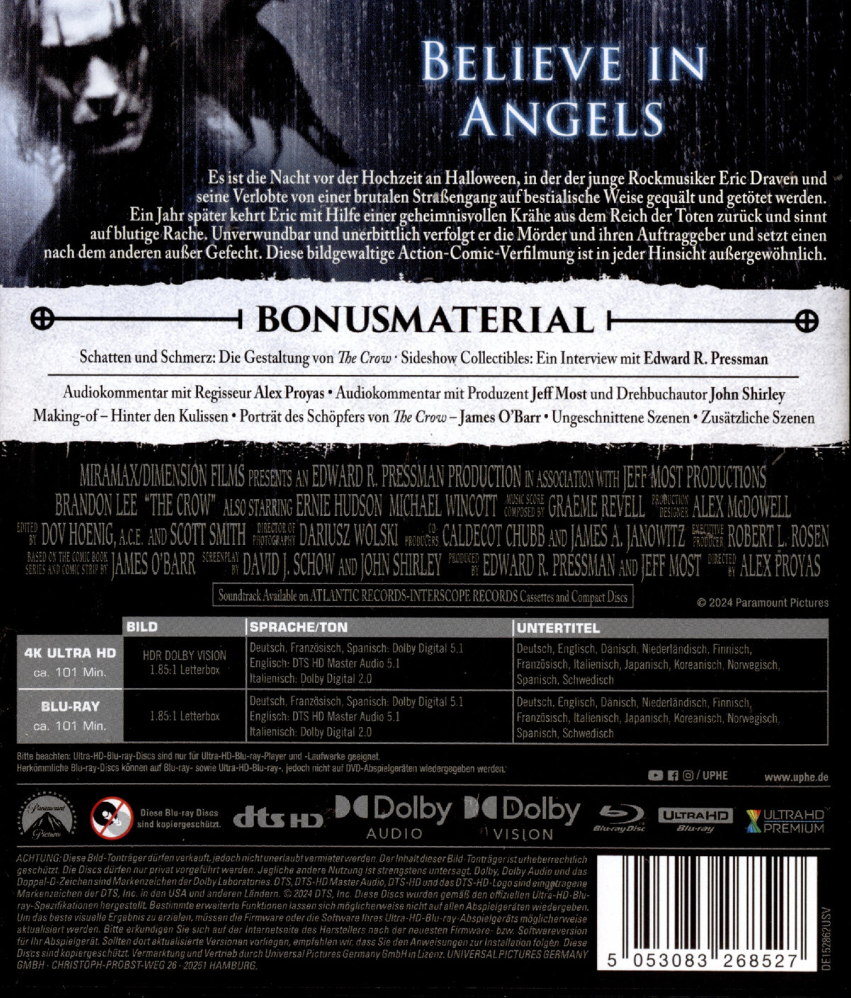 Enthält 4K UHD & Blu-ray,Die Gestaltung von "The Crow",Sideshow Collectibles: Ein Interview mit Edward R. Pressman,Audiokommentare,Making of,Porträt des Schöpfers von "The Crow" - James O'Barr,Ungeschnittene Szenen,Zusätzliche Szenen