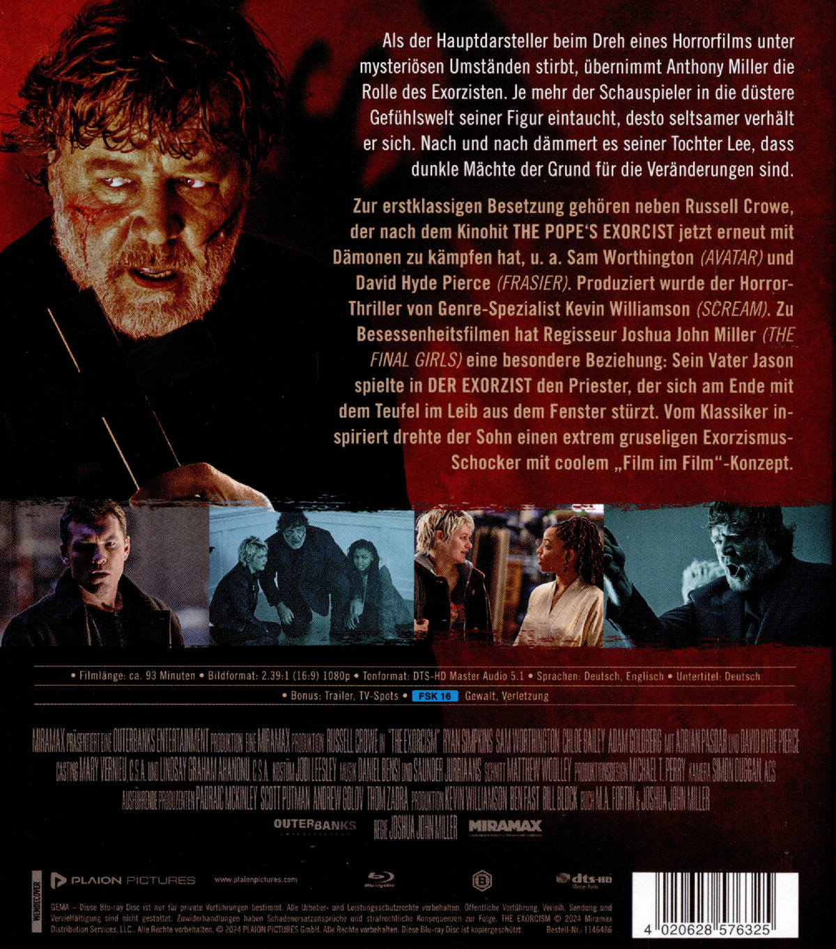 Zur erstklassigen Besetzung gehören neben Russell Crowe, der nach dem Kinohit THE POPE'S EXORCIST jetzt erneut mit Dämonen zu kämpfen hat, u. a. Sam Worthington (AVATAR) und David Hyde Pierce (FRASIER). Produziert wurde der Horror-Thriller von Genre-Spezialist Kevin Williamson (SCREAM). Zu Besessenheitsfilmen hat Regisseur Joshua John Miller (THE FINAL GIRLS) eine besondere Beziehung: Sein Vater Jason spielte in DER EXORZIST den Priester, der sich am Ende mit dem Teufel im Leib aus dem Fenster stürzt. Vom Klassiker inspiriert drehte der Sohn einen extrem gruseligen Exorzismus-Schocker mit coolem „Film im Film“-Konzept.