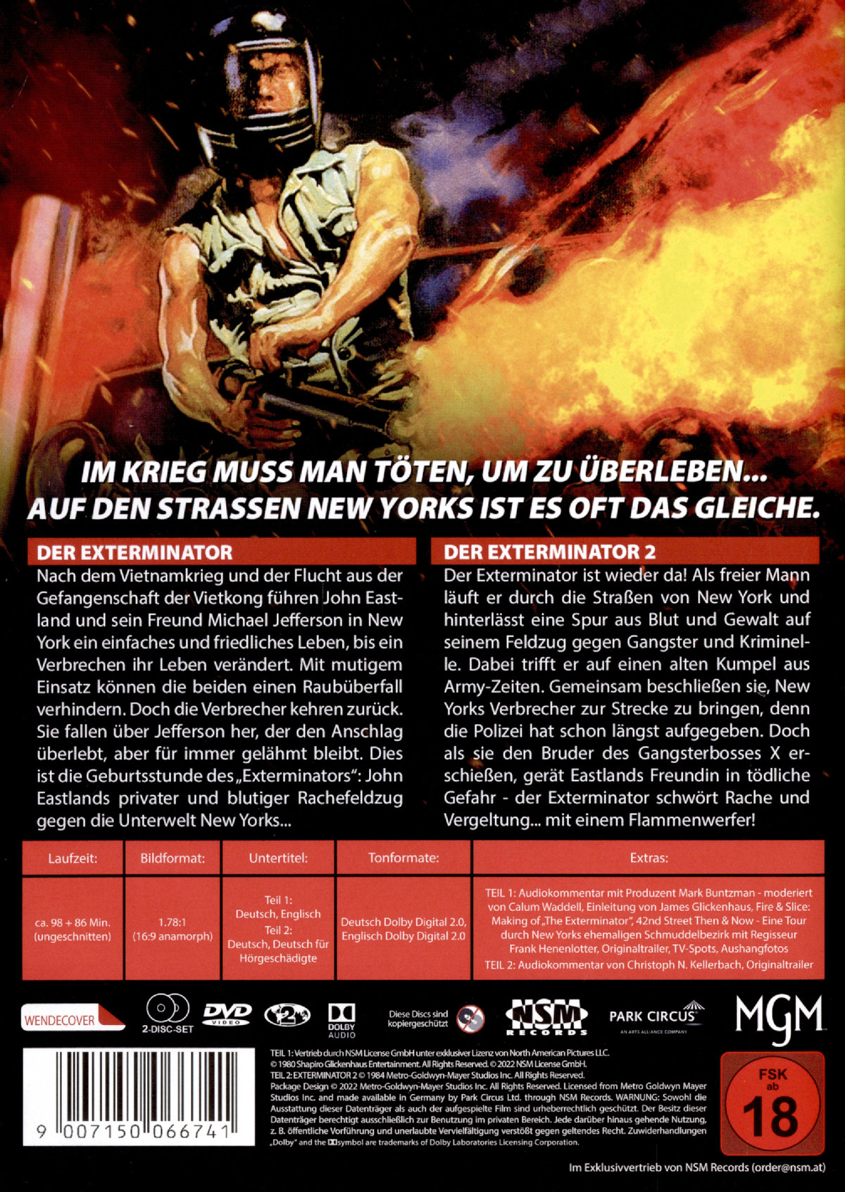 EXTERMINATOR Nach Vietnamkrieg und Flucht aus der Gefangenschaft der Vietkong führen John Eastland und sein farbiger Freund Michael Jefferson in New York ein einfaches und friedliches Leben, bis ein Verbrechen geschieht. Mit mutigem Einsatz können die beiden ehemaligen Frontkämpfer einen Raubüberfall verhindern. Doch die Verbrecher kehren zurück. Sie fallen über Jefferson her, der den Anschlag überlebt, aber für immer gelähmt bleibt. Die Geschichte vom „Exterminator" ist die grausame Rache John Eastlands an der New Yorker Unterwelt. Gnadenlos wütet er unter den Drogenhändlern, Dieben sowie Gangstern und wird nach einer Serie spektakulärer Morde beinahe zum Volkshelden. Die Behörden müssen jedoch diesen privaten Rachefeldzug stoppen, denn selbst die Regierung in Washington ist inzwischen besorgt. So erhält CIA-Detektiv James Dalton den Auftrag, den „Exterminator" auszuschalten... EXTERMINATOR 2 Der Exterminator ist wieder da! Als freier Mann läuft er durch die Straßen von New York und hinterlässt eine Spur aus Blut und Gewalt auf seinem Feldzug gegen Gangster und Kriminelle. Dabei trifft er auf einen alten Kumpel aus Army-Zeiten. Gemeinsam beschließen sie, New Yorks Verbrecher zur Strecke zu bringen, denn die Polizei hat schon längst aufgegeben. Doch als sie den Bruder des Gangsterbosses X erschießen, gerät Eastlands Freundin in tödliche Gefahr - der Exterminator schwört Rache und Vergeltung... mit einem Flammenwerfer!