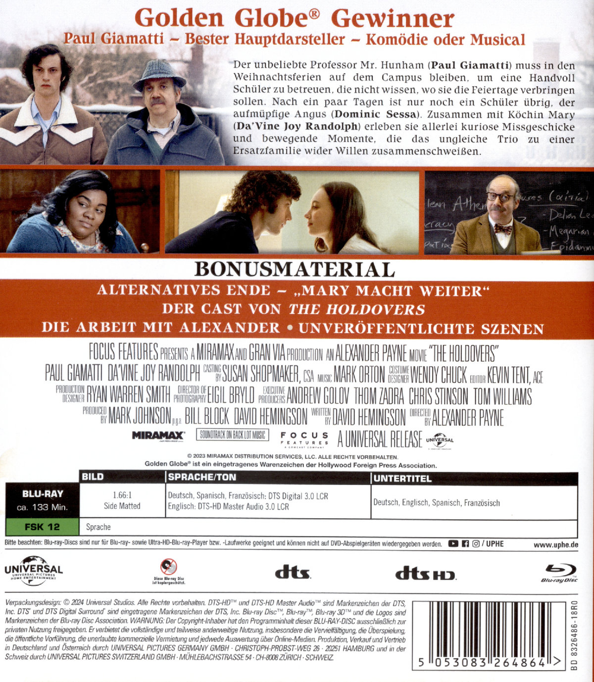 Der griesgrämige Professor Mr. Hunham (Paul Giamatti) ist gezwungen, in den Weihnachtsferien auf dem Campus zu bleiben, um eine Handvoll Schüler zu betreuen, die nicht wissen, wo sie die Feiertage verbringen sollen. Nach ein paar Tagen ist nur noch ein Schüler übrig, der aufmüpfige Angus (Dominic Sessa). Zusammen mit Köchin Mary (Da'Vine Joy Randolph) erleben sie allerlei kuriose Missgeschicke und bewegende Momente, die das ungleiche Trio zu einer Ersatzfamilie wider Willen zusammenschweißen. Von Oscar®-Gewinner Alexander Payne, der sich wie kein Zweiter auf warmherzige Geschichten voller Menschlichkeit versteht.AuszeichnungenGolden Globe Awards 2024 - Auszeichnung als Bester Hauptdarsteller - Komödie/Musical (Paul Giamatti)- Auszeichnung als Beste Nebendarstellerin (Da'Vine Joy Randolph)- Nominierung für den Besten Film - Komödie/MusicalBritish Academy Film Awards 2024 (BAFTA)- Auszeichnung als Beste Nebendarstellerin (Da'Vine Joy Randolph)- Nominierung als Bester Hauptdarsteller (Paul Giamatti)- Nominierung für den Besten Film (Mark Johnson)- Nominierung für die Beste Regie (Alexander Payne)- Nominierung für das Beste Originaldrehbuch (David Hemingson)