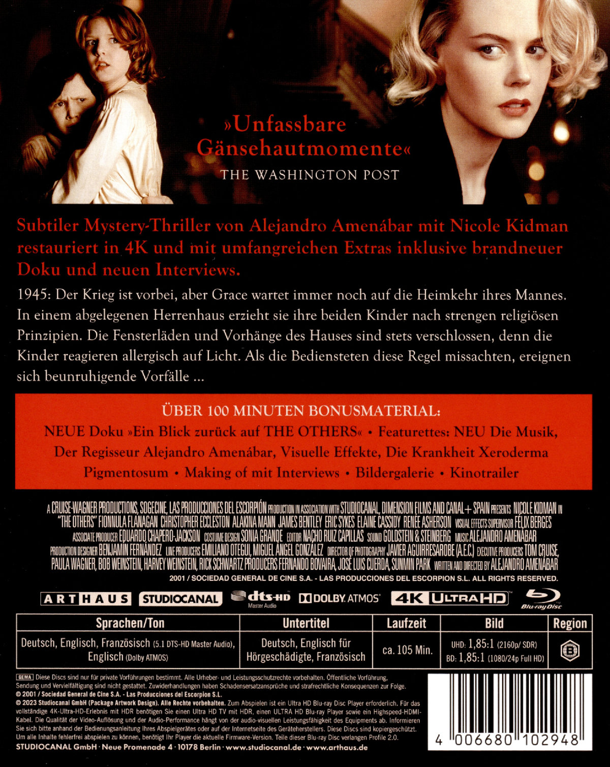 | Zus.Info | Featurettes: Ein Blick zurück auf THE OTHERS; Ein Blick auf THE OTHERS; Der Regisseur Alejandro Amenábar; Visuelle Effekte; Die Krankheit Xeroderma pigmentosum; Making of; Bildergalerie; Kinotrailer; |